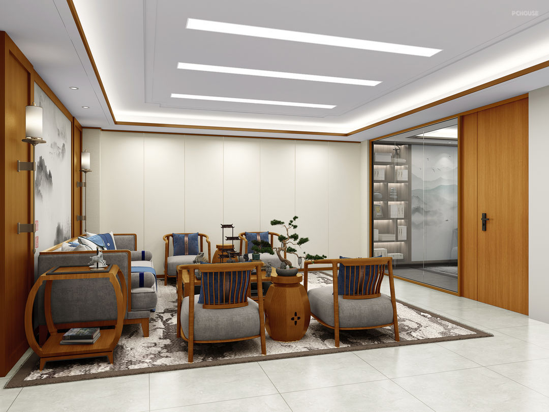 选材精良制艺精湛的中式家具布满整个空间,其上细密的纹理与优雅的造型赋予空间稳重淡雅的独特魅力,慢下来,体会认真却又随性的洽谈态度。