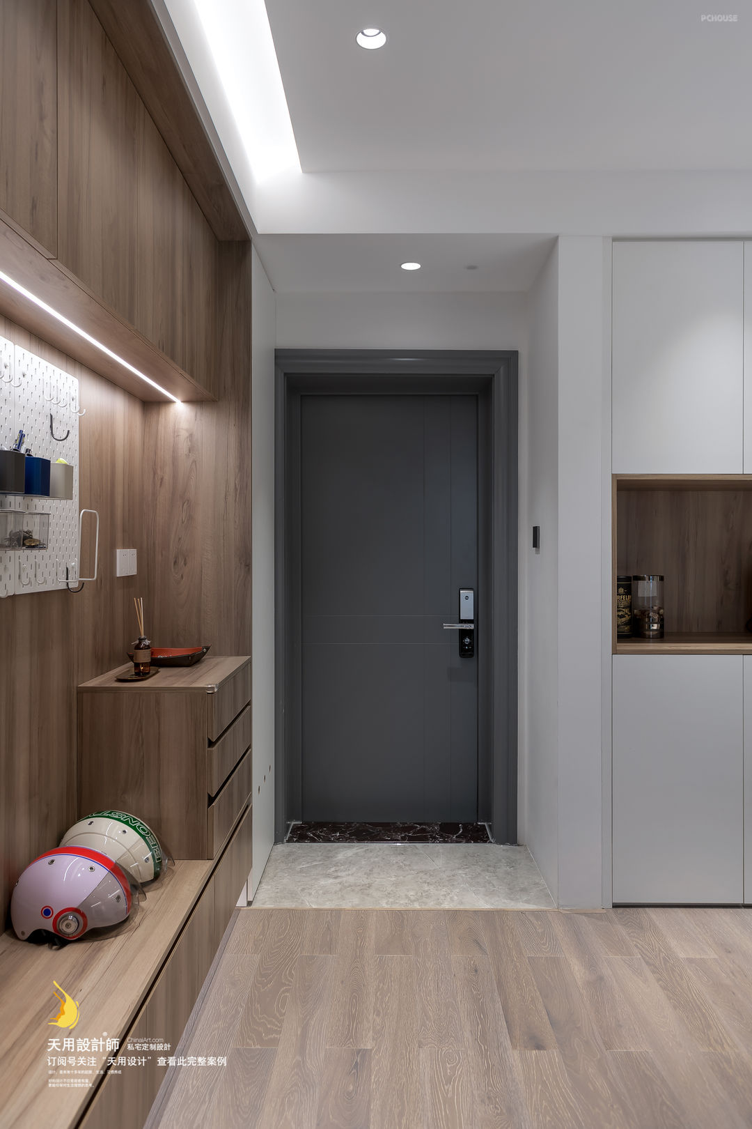 推门入户为短廊型玄关。玄关柜设计遵循居者使用习惯,既有直接放置的台面、抽拉式抽屉,又有挂起来的洞洞板和挂钩等,以灵活形式满足不同需求。