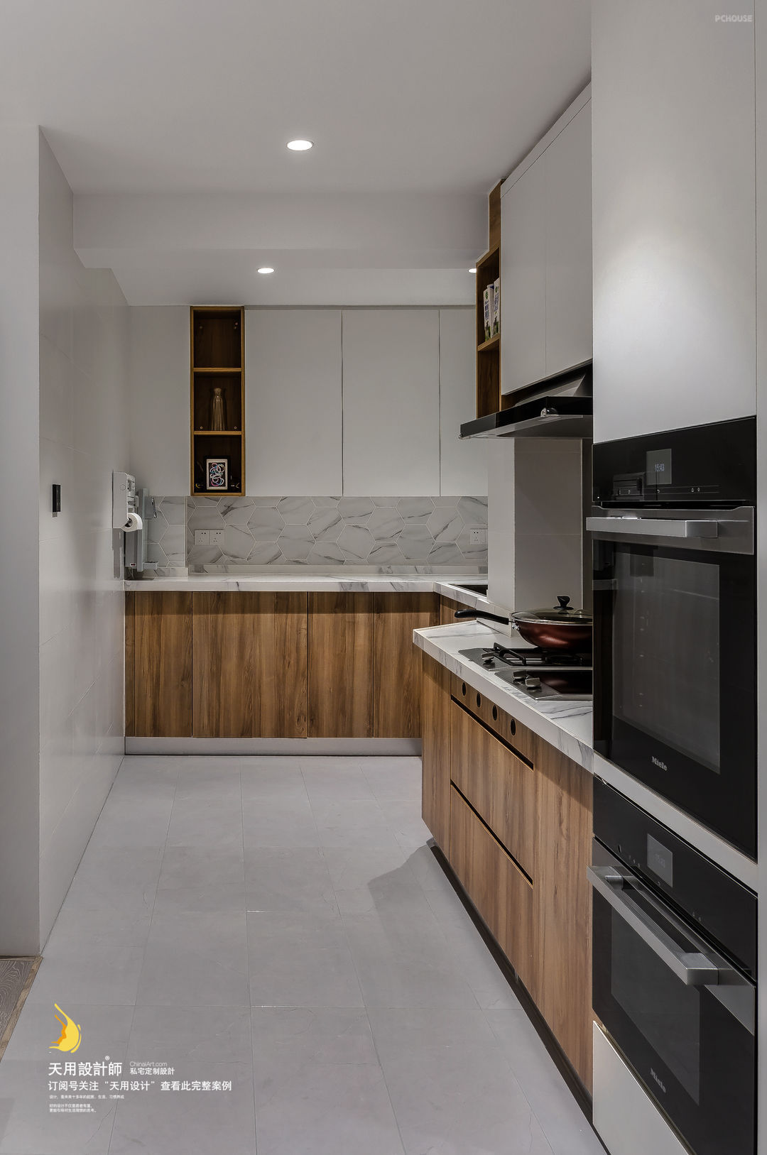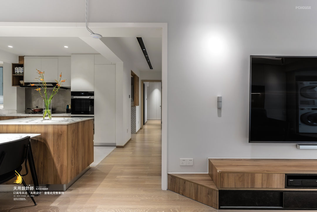 设计团队并不因此做成一整片极简柜面,而是为不同功能的使用做了不一样的风格设计。白色和木色的搭配,不会显得过于繁杂,亦可以很好地区分区域和功能。