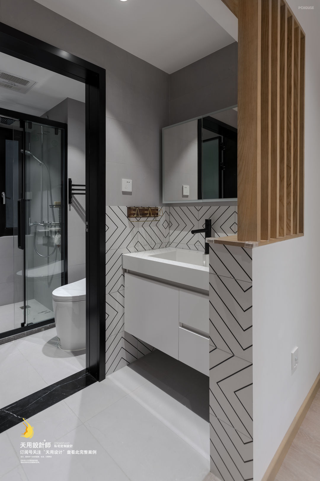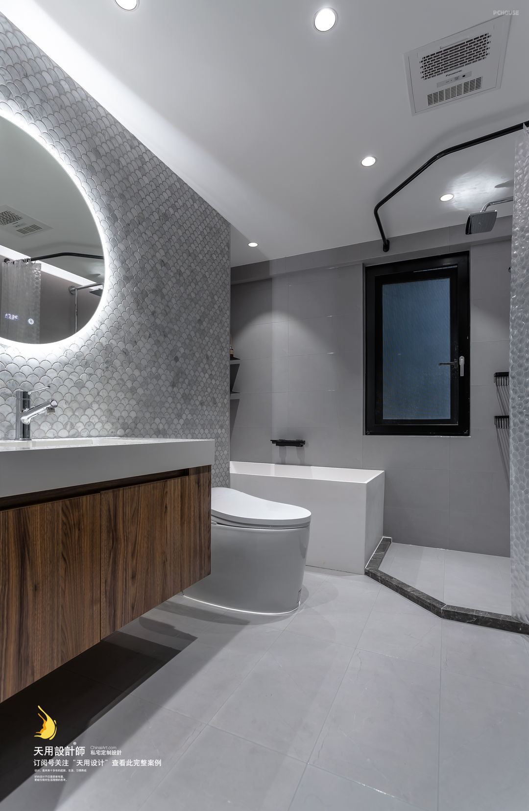 深浅不一的鱼鳞扇形马赛克,将天然肌理融入品质的生活美学中,使主卫更具独特性,亦展现了居者鲜明的性格特点。