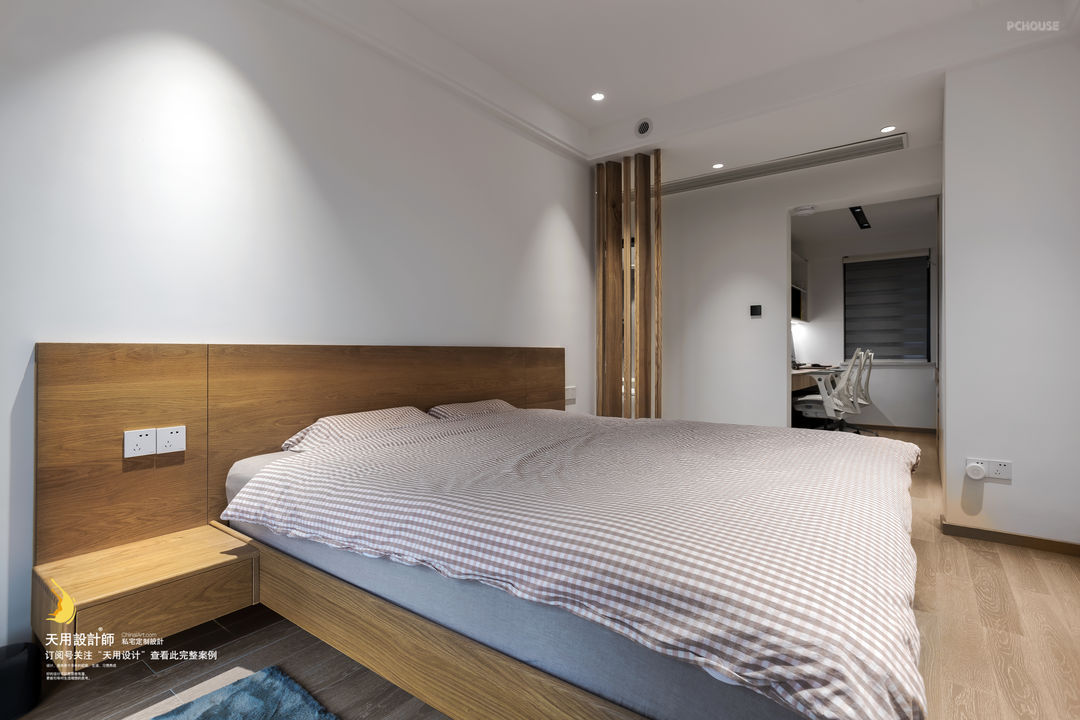 主卧分为睡眠区和工作区。睡眠区没有过多的陈设和装饰,简约大气的色调,柔软亲肤的床铺,简简单单地营造出适合放松休息的空间。