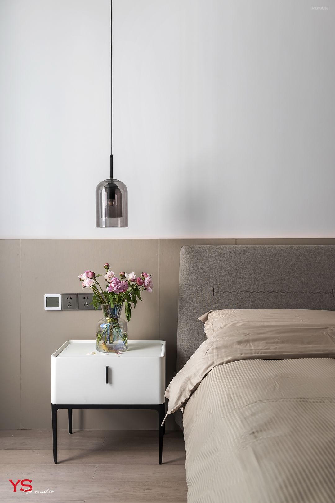 而床的边缘,是圆弧形的围绕包裹,它实际上是一个圆床,却又在视觉上让你看不出。大尺寸的床体与背后一整面墙的软包在材质上有所呼应,材质在这里做得很纯粹。