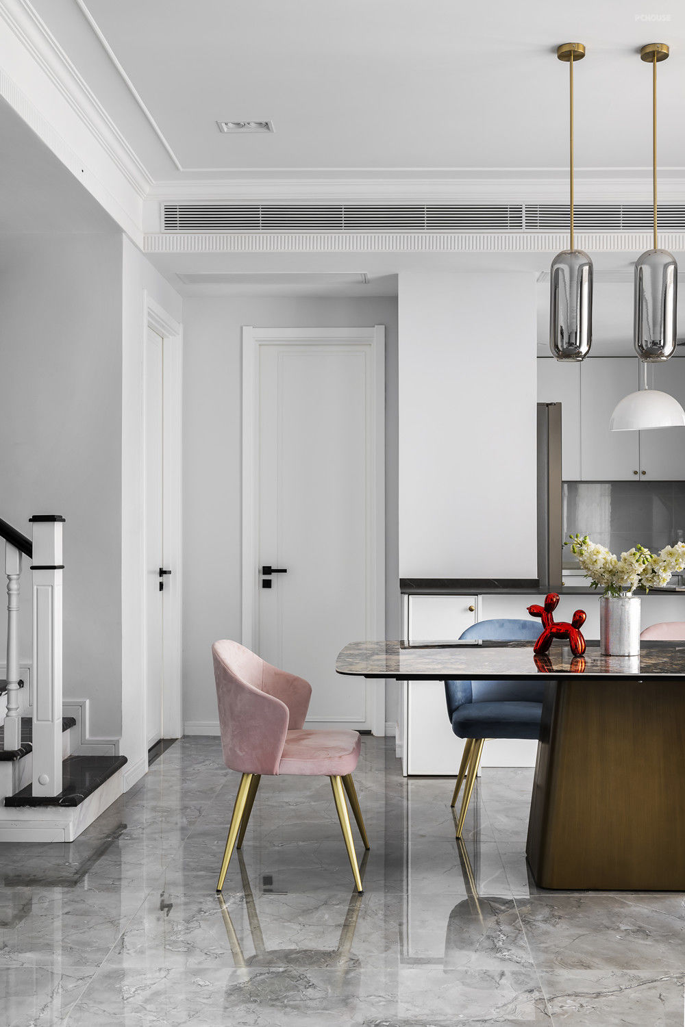 冷调的蓝色在干净的基础上增添了一份静谧,蓝色作为背景色,让空间更添层次感。在一楼家具的选择上则是点缀以粉色,粉蓝CP自成一派,色彩的高级感迎面而来。