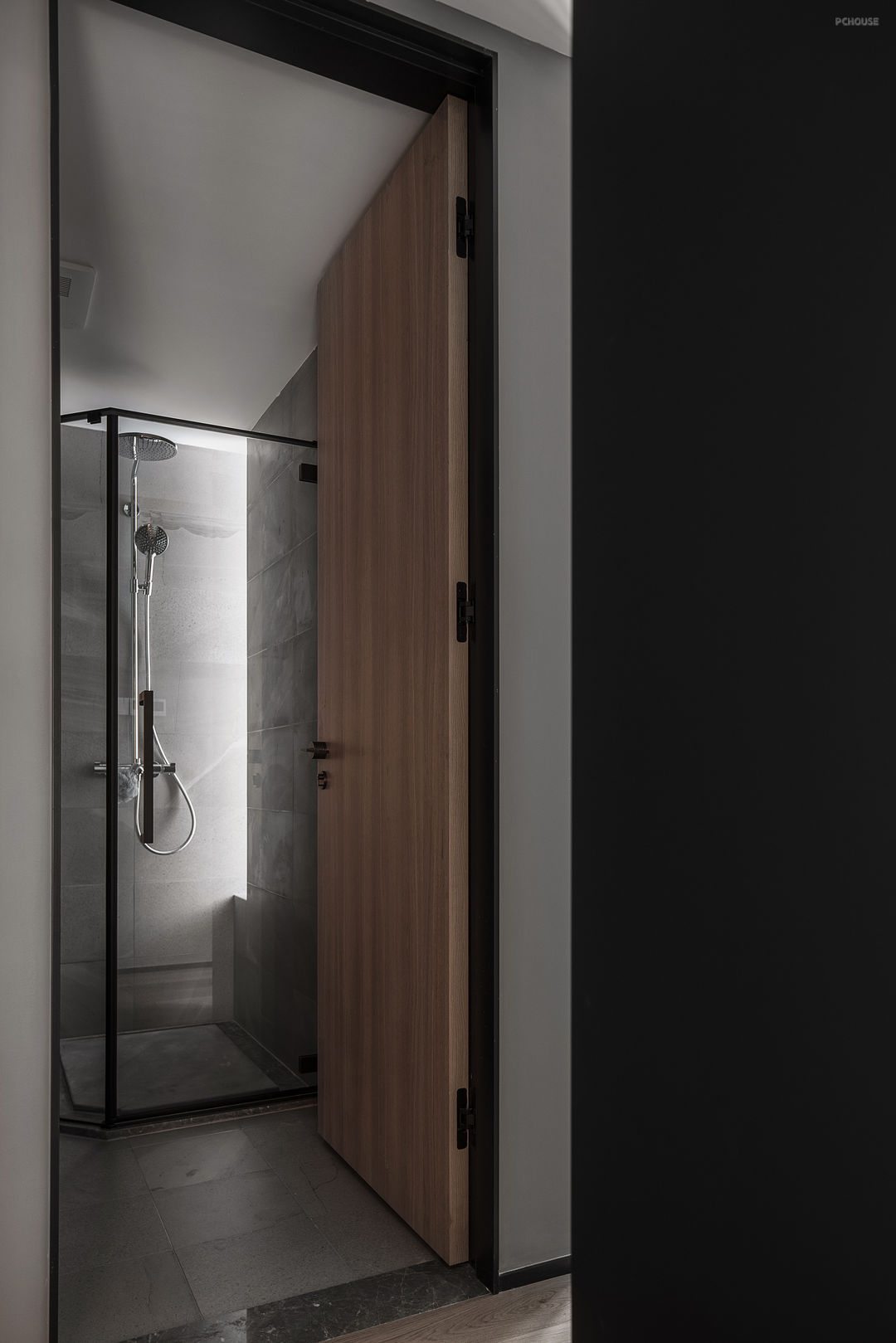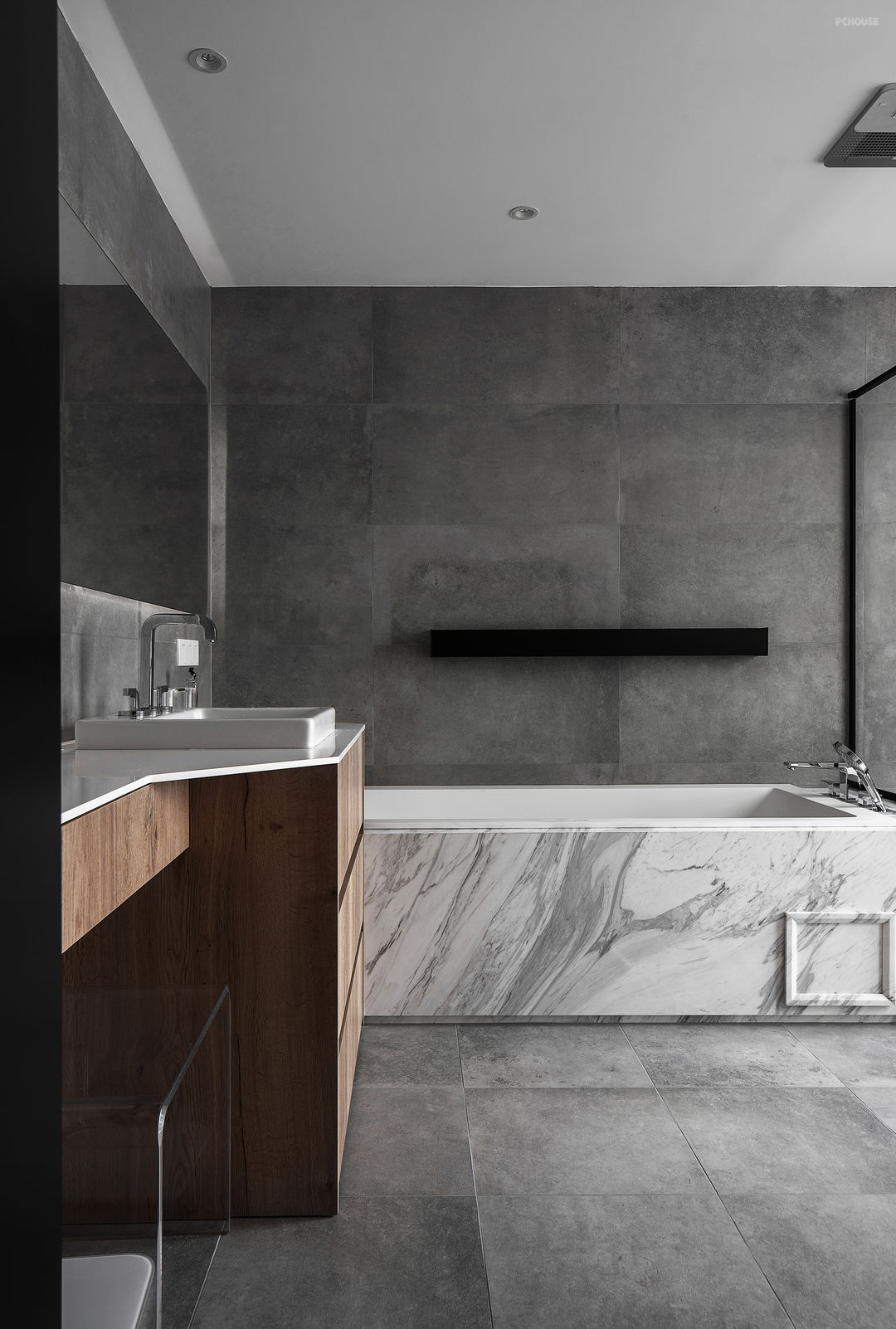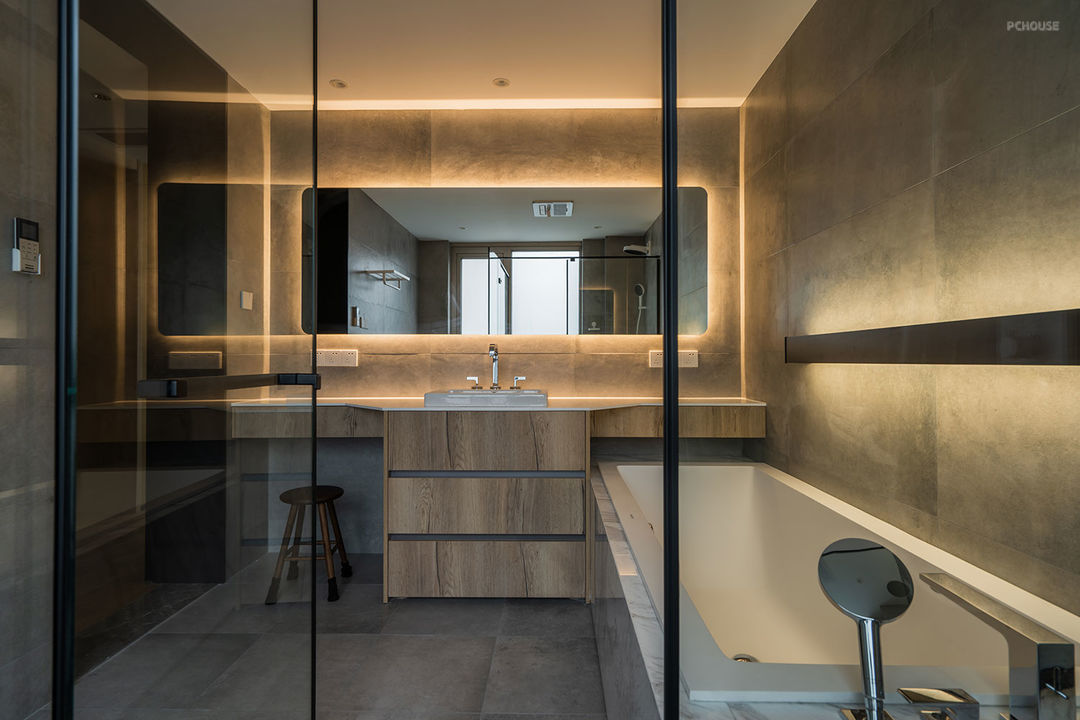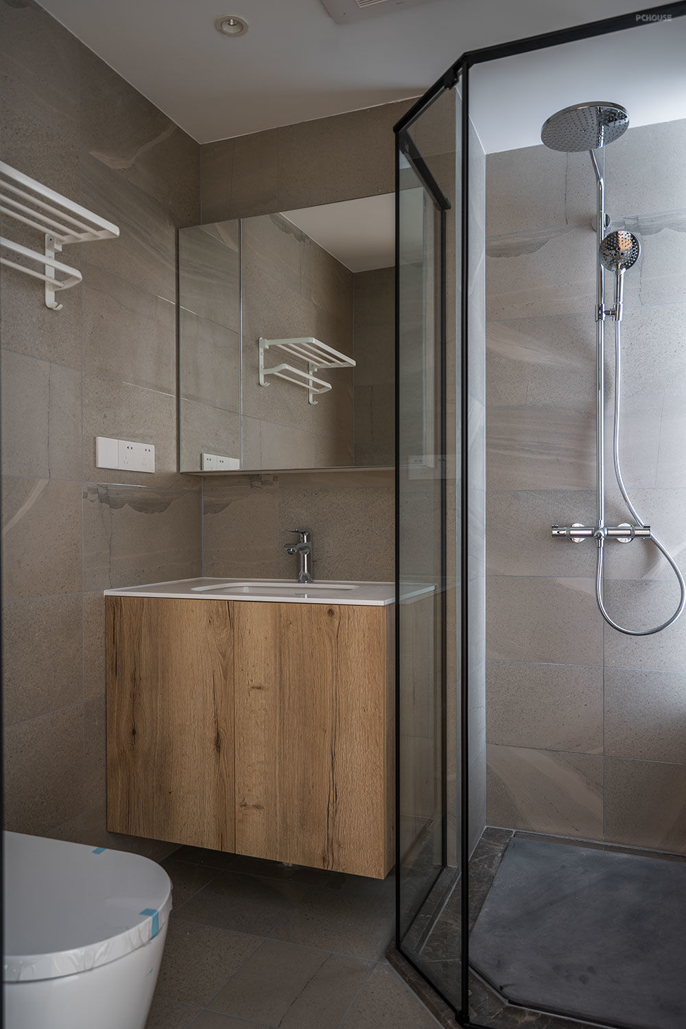 镜面反射下的卫生间,台盆来自维宝,龙头来自汉斯格雅,淋浴采用的是墙出水方式。