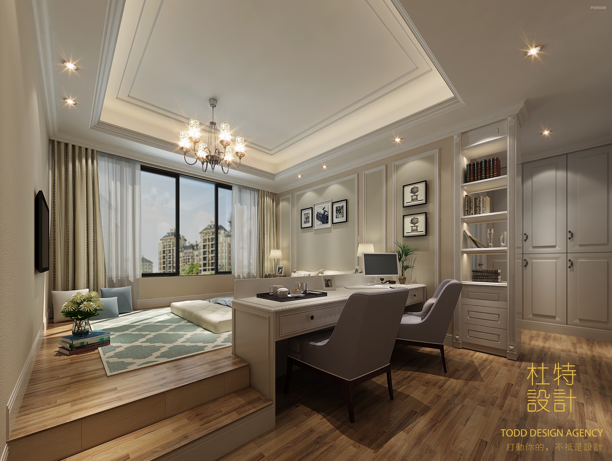 让房间一改美式传统风格,用轻美的风格补进来,这样书房和休息的区域变成了一个明亮轻快的地方,有着自己的休息的天地和工作的区域。把飘窗的位置改成榻榻米床,即节省空间又能给人眼前一亮的惊喜,这样让能一眼就看出这是美式+的风格。