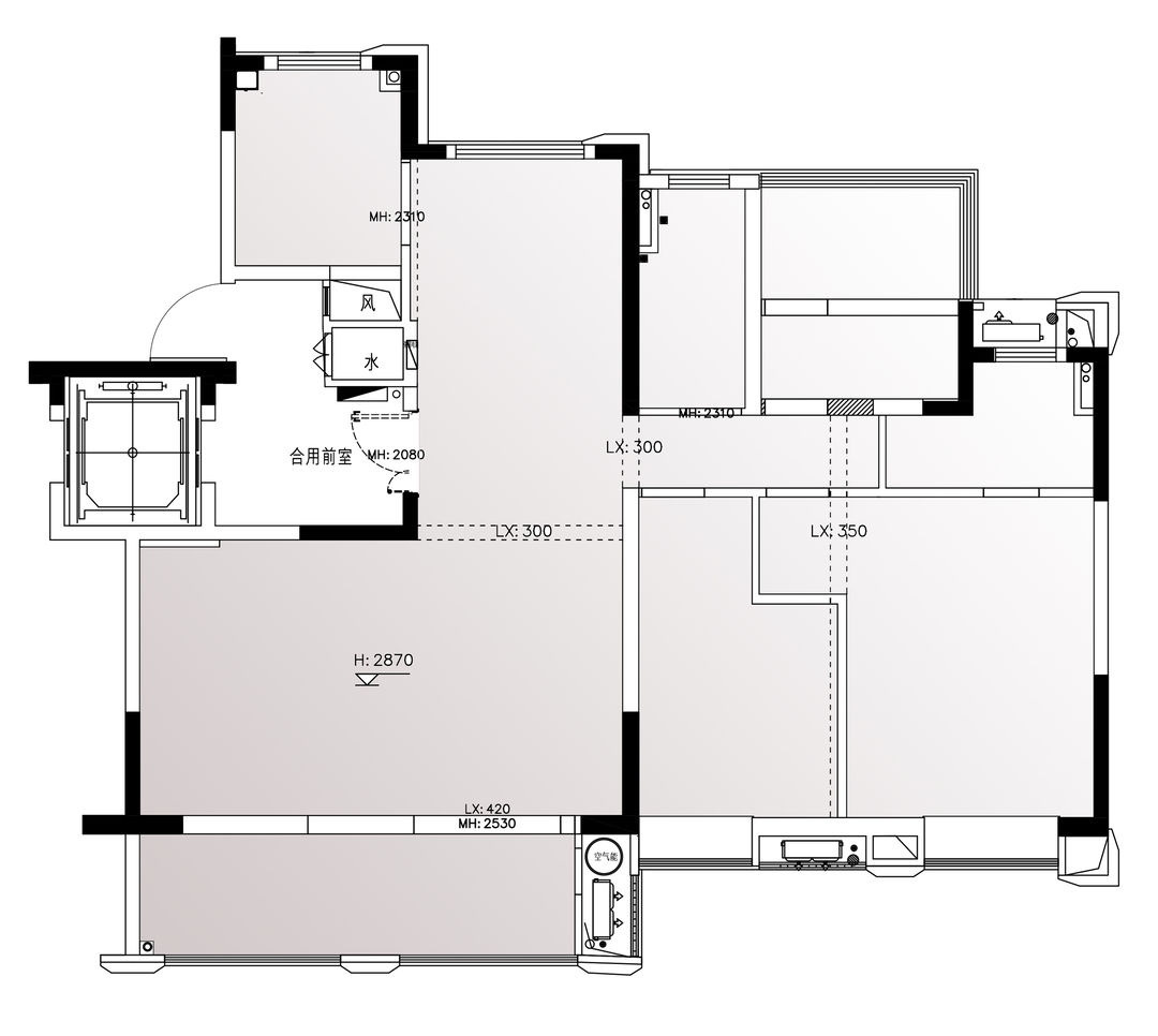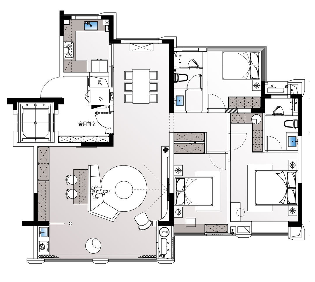 1、拆墙,阳台并入客厅,扩大面积;增西厨,丰富空间功能