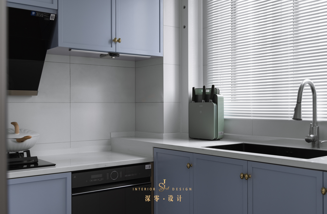 现场打造的橱柜,柜面用低饱和度的温柔雾霾蓝打底,通过色彩就能将厨房的美学意义最大化。