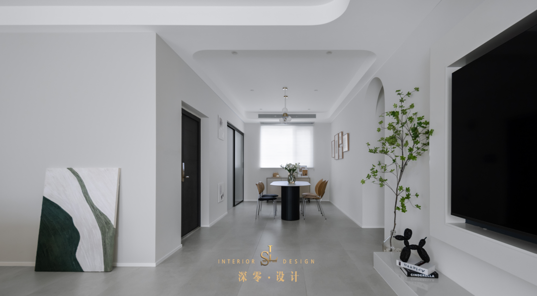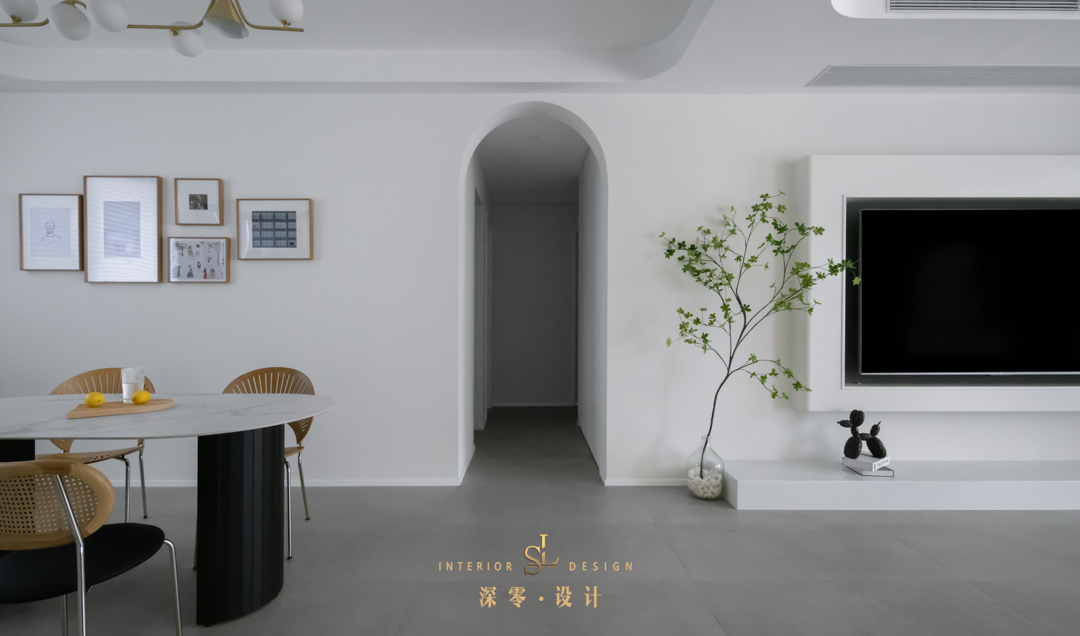 用拱形门洞串联动静区,呼应动区的曲线元素,也增加了形式美,将空间可视范围提升到最大。走廊空间自然也没有被浪费,利用墙体做了一面顶天立地的内嵌式收纳柜,完善客餐厅的收纳任务。