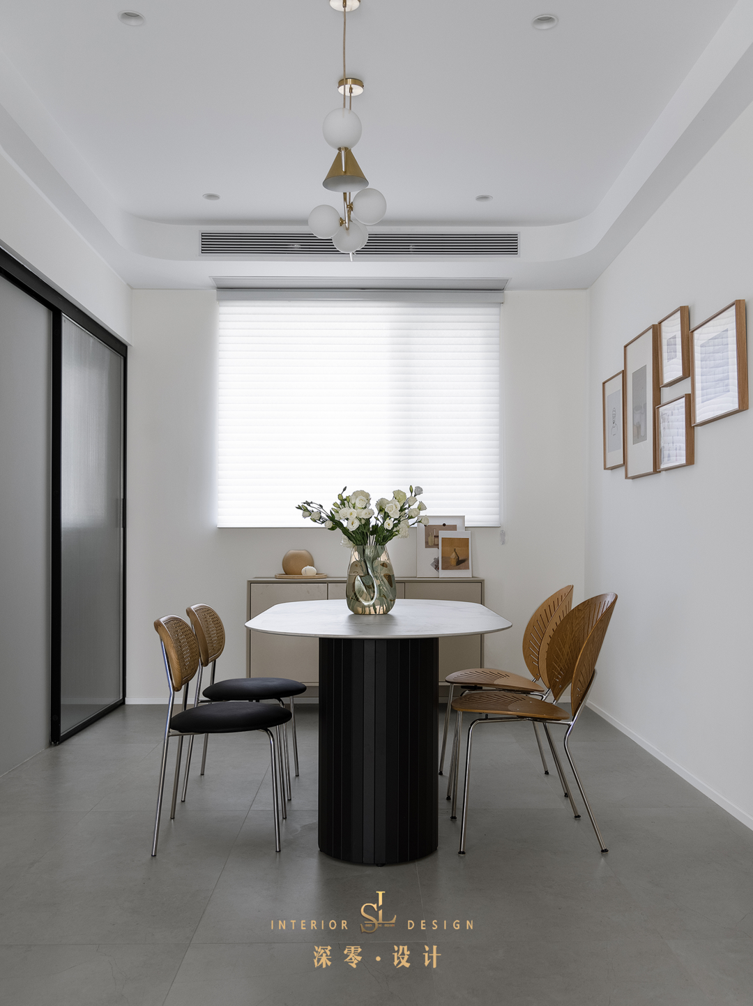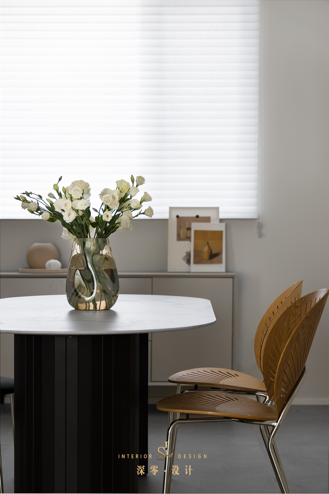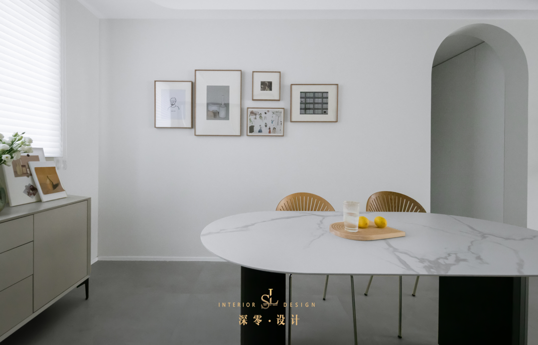 餐厅留白的墙面也搭配了一组简约装饰画,淡颜系餐厅也可以将美商拉满!