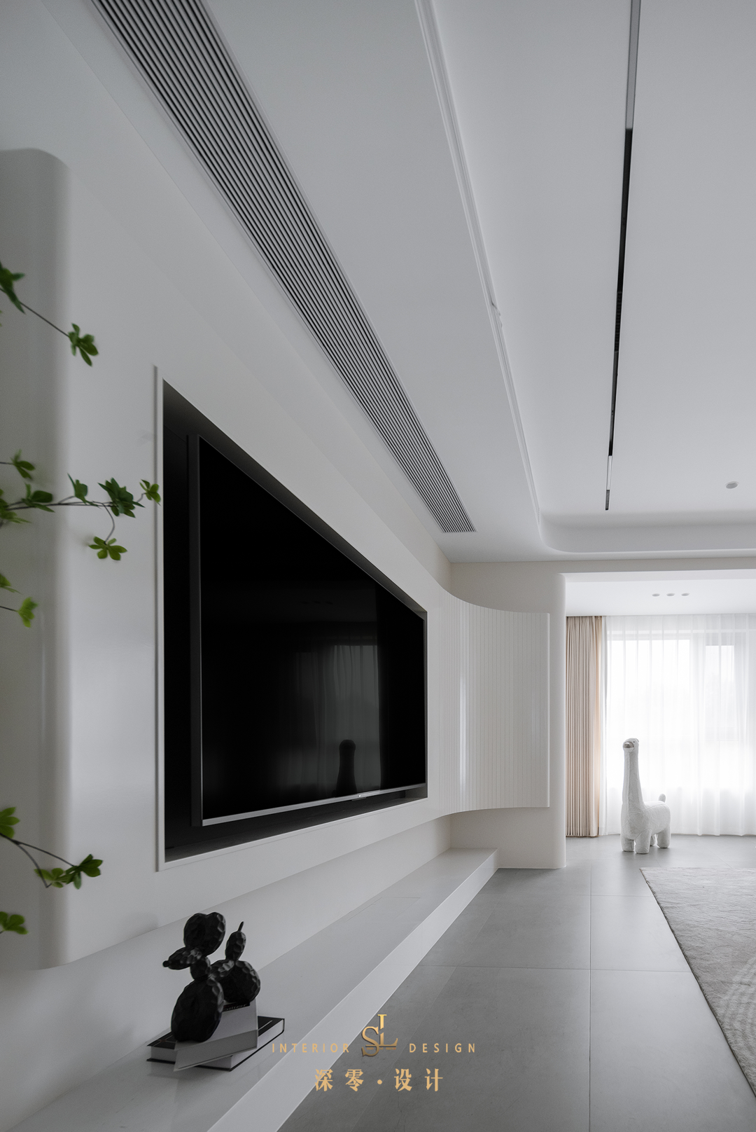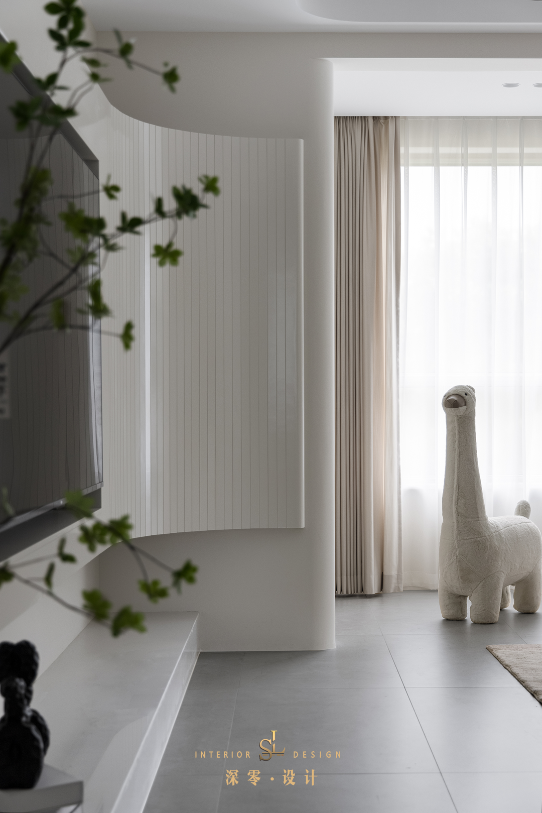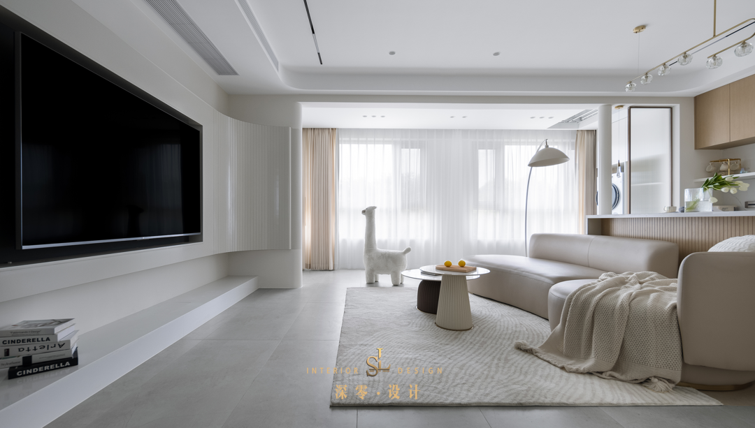 曲线电视墙造型流畅,石材地台点睛背景墙,拉伸了视觉高度。地台底部也特意预留了一个小口,方便收纳插座电线。