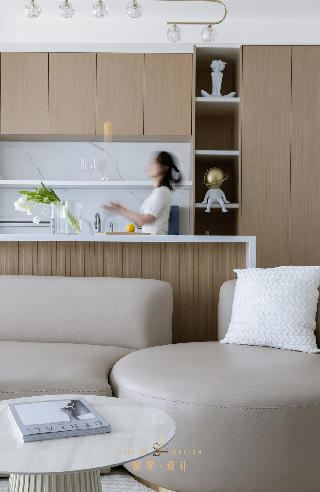 借助横厅优势,在沙发后新增一个西厨区域,并用吧台隔开,将阅读、休息、互动、收纳融为一体,丰富居家使用功能。吧台和柜体用原木色打底,不仅清爽了空间氛围,也增加了视觉层次感。
