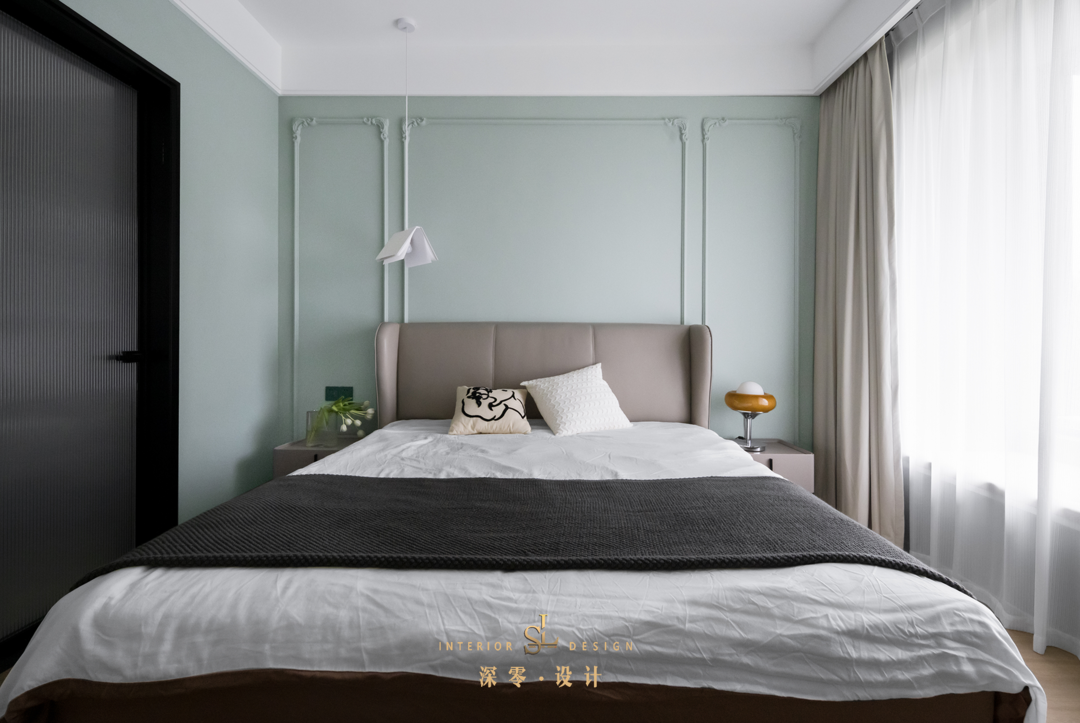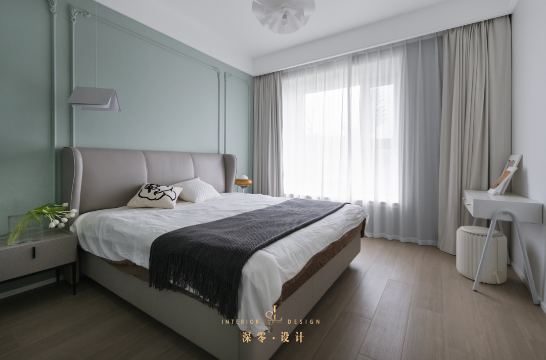 “形于色”的卧室,是家里另一个大美不言的区域!床头背景墙用伦敦雾作为主色,搭配优雅气质的石膏线造型,轻奢有度,浪漫刚好。