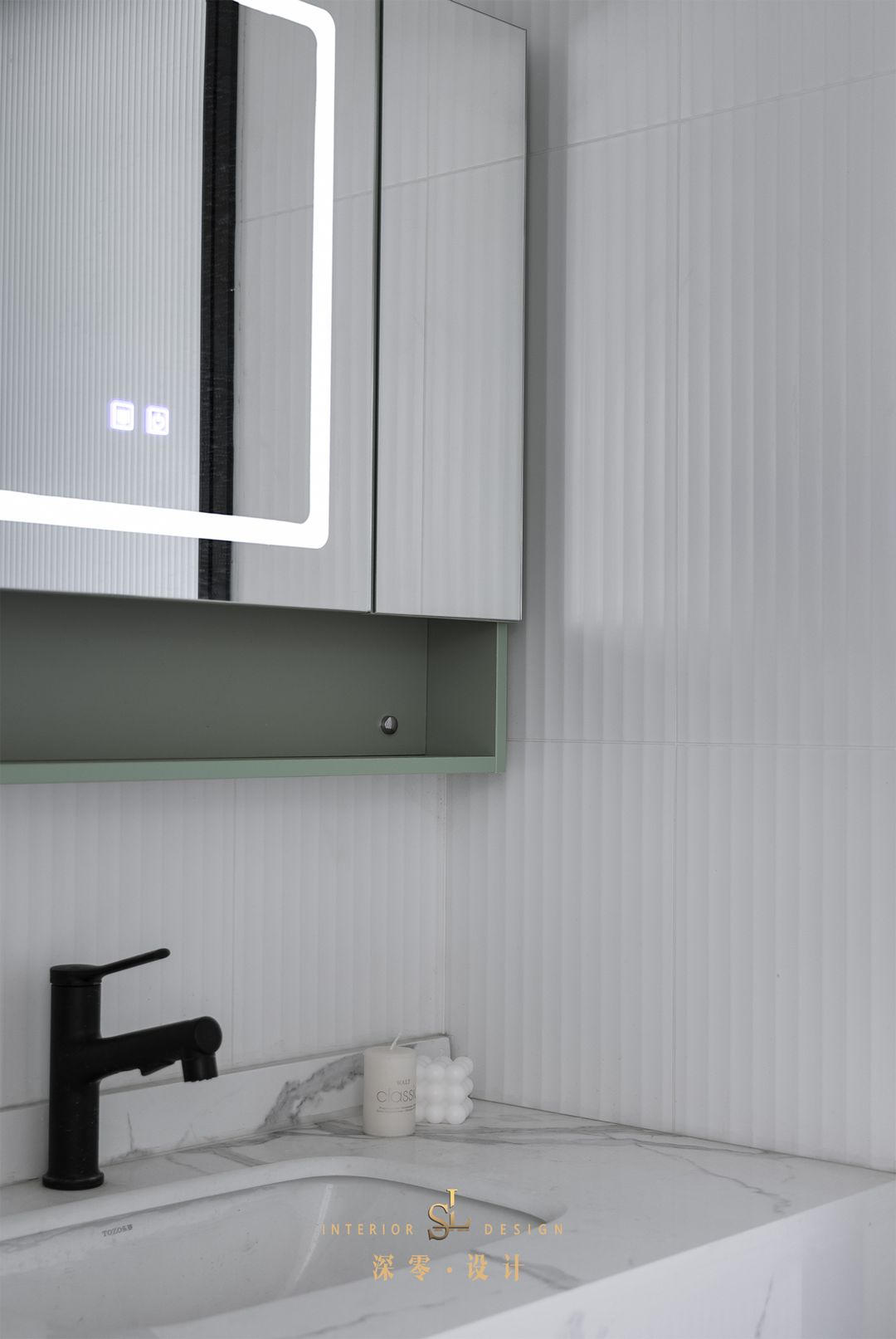 客卫被一分为二,外移的洗漱台墙面用波浪砖铺贴,相比于传统墙砖,虽然它也是单色,但是视觉感更加立体,装饰性更强!自带智能调节的镜柜,也能兼顾一定的收纳功能,从而解放台面空间。
