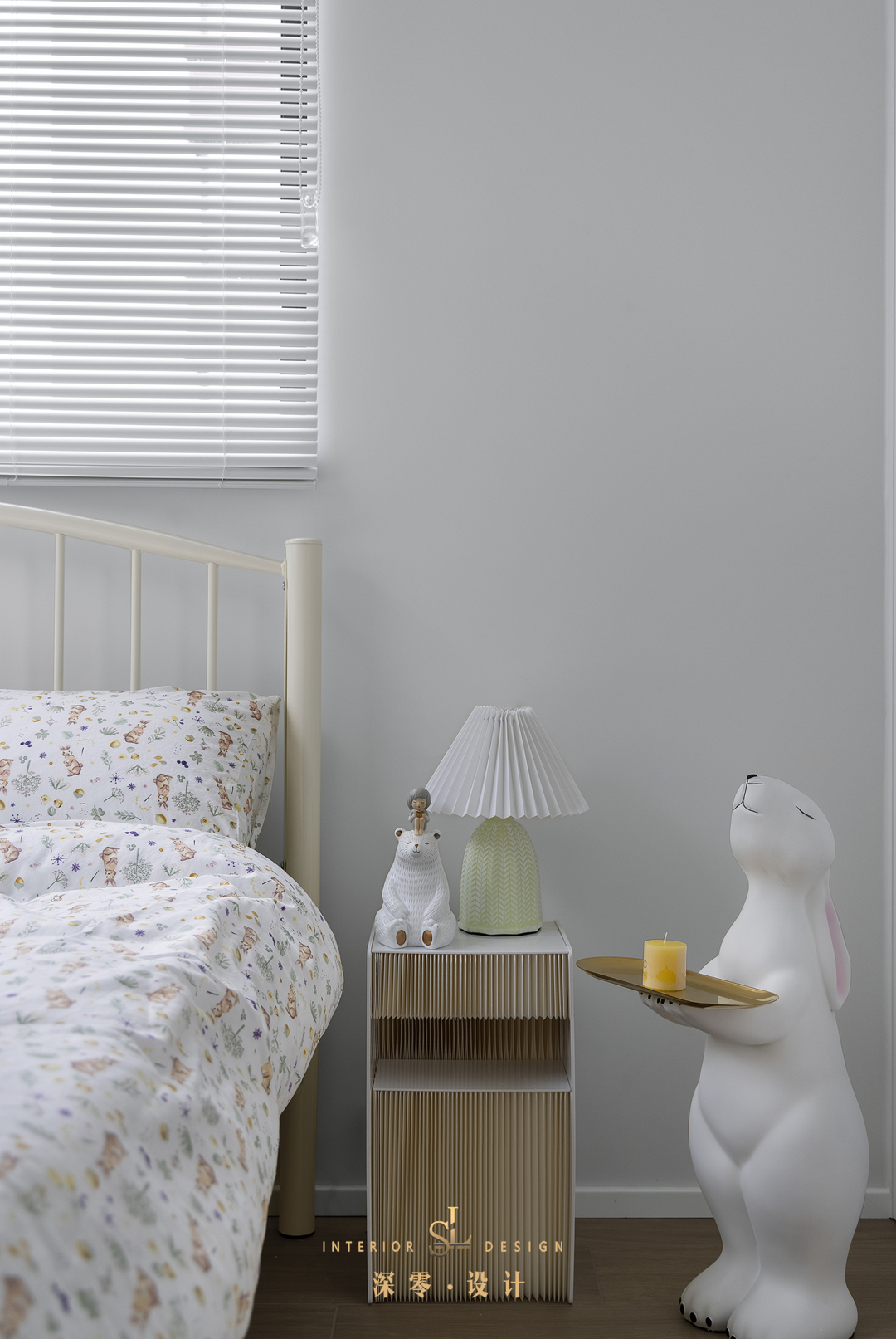 用百叶帘来代替传统布帘,视觉上更轻便,很适合小户型卧室使用。床品、床头柜到小摆件的选择,每一个都意趣横生,共同构筑起小小卧室的专属仪式感。