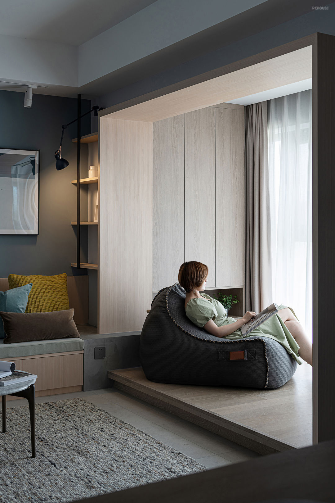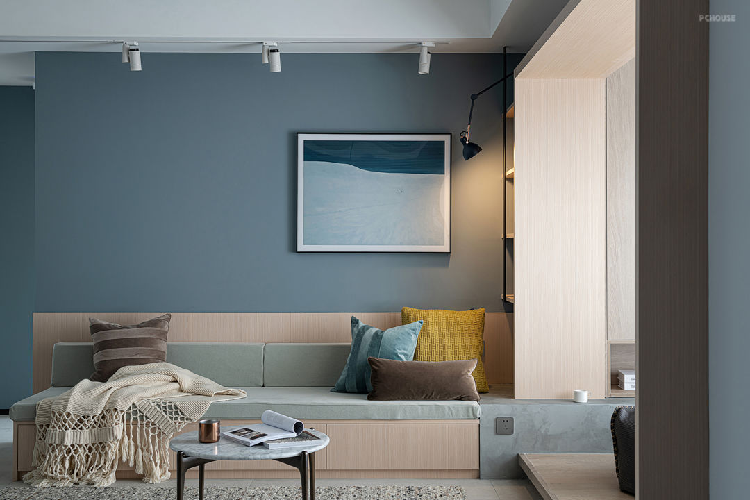 因此我在这个家的设计中, 更倾向于“减法”的设计,以塑造一个简洁的空间。取消主沙发,在空间中置入卡座——以几何体块插入空间,与阳台的体块交错叠加、相互嵌合,形成一个大的围合。
