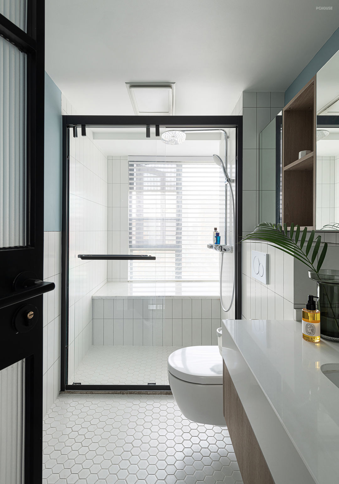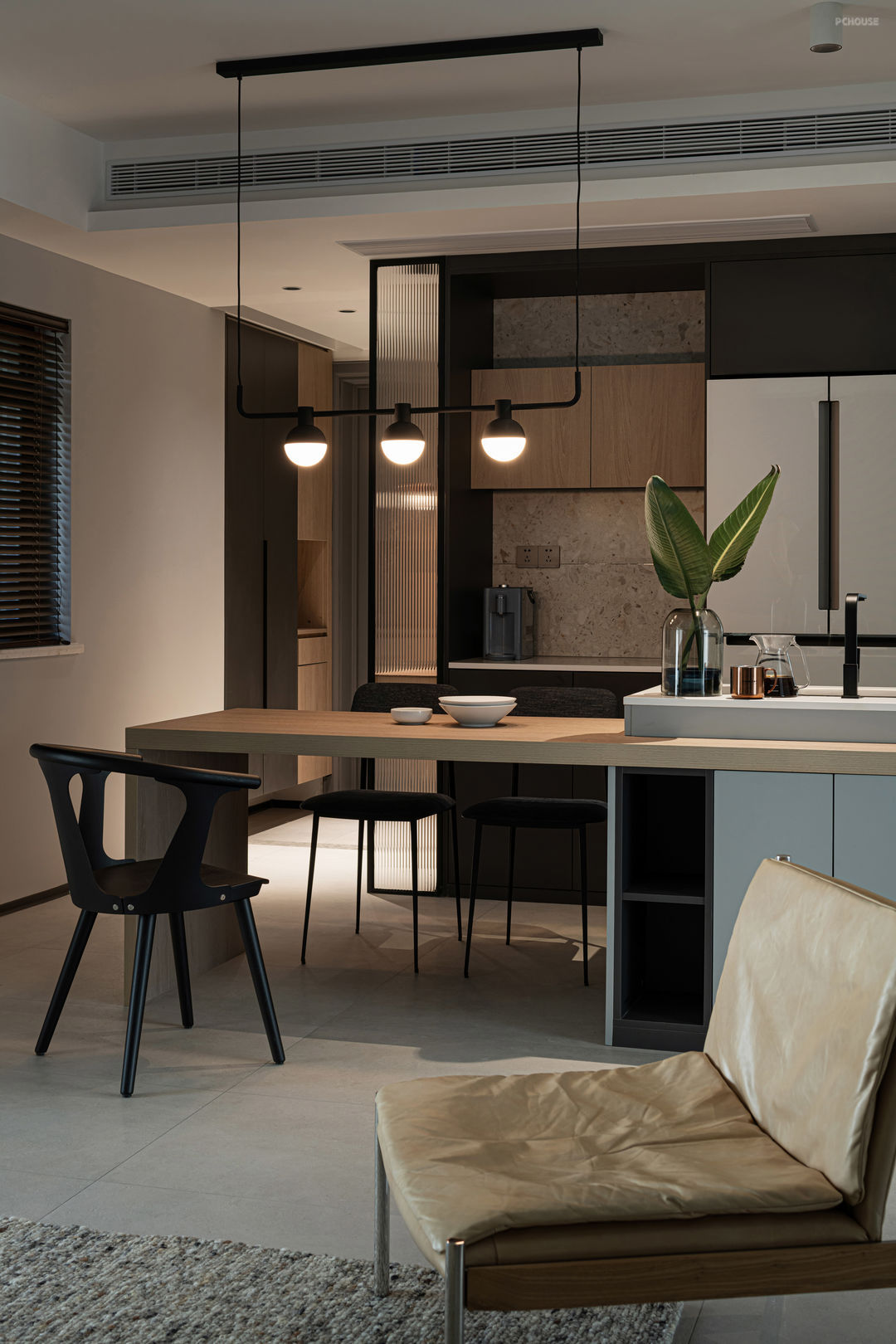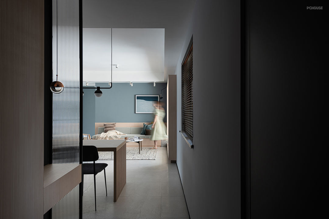 长虹玻璃为空间引入光线,代表一份明亮,营造一个敞亮的空间。作为一道可切换的界限与隔断,也作为一个可延伸的共同联结,它没有完全地切断空间,而在视觉上形成一个连绵而有层次的空间。