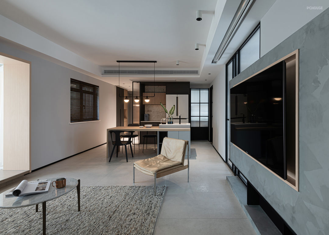 在这样的空间中, 家具被弱化,这些空间的构件(功能与装饰)都“退化”于空间的基础层。在这个棱角分明的空间在几何体块中组建家具在体块之间的合并与穿插中,于空间拉伸出一个平静的场域。