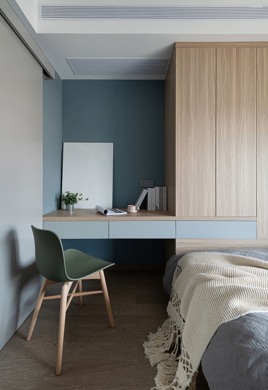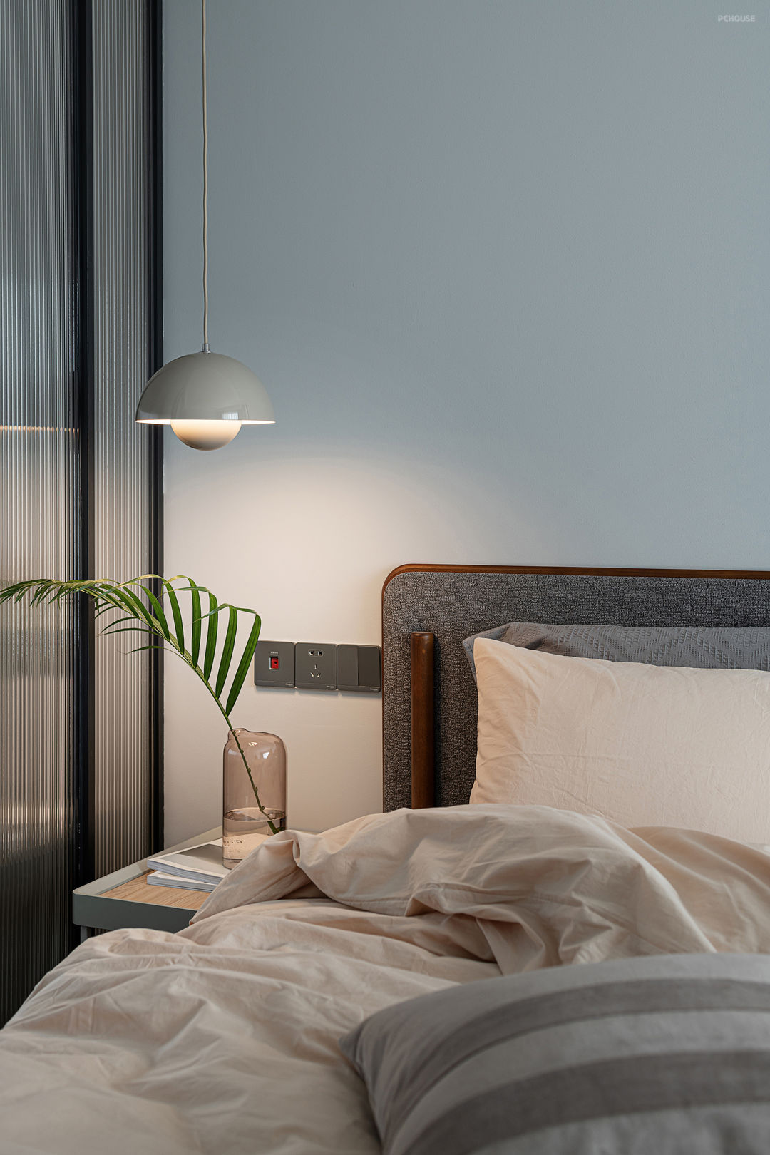 以素色的浅灰色为基调,低饱和度的蓝色搭配温润的木质,清新自然。设计师将这份柔和置于空间,温暖而亲密,空间不失女性色彩的温婉与恬静。