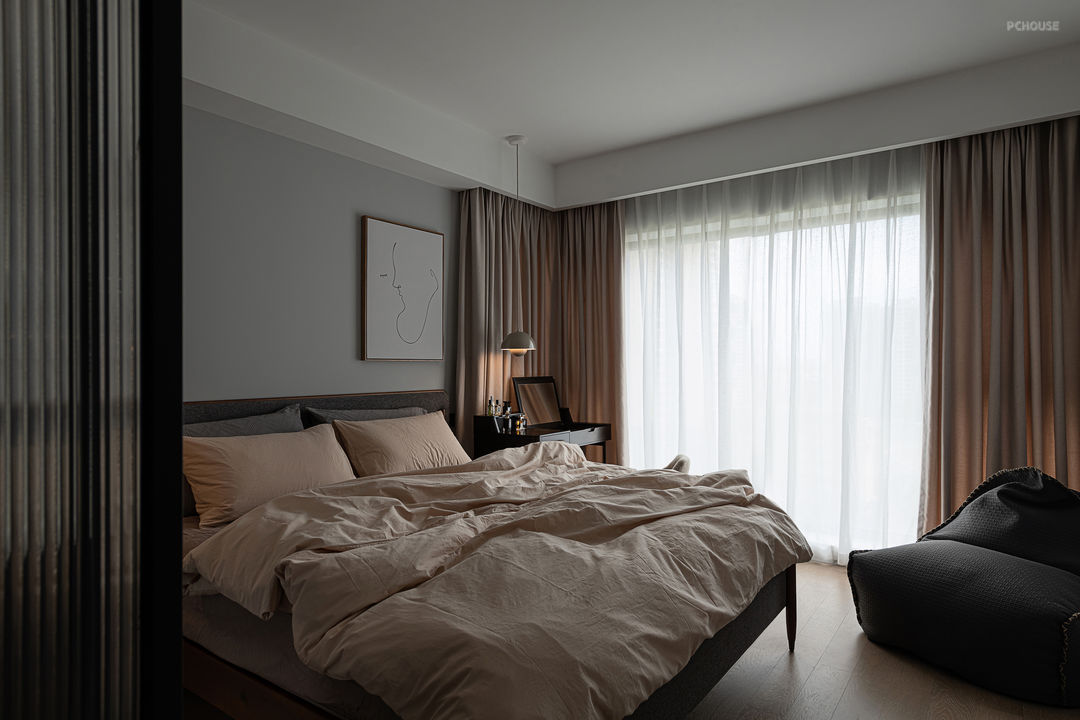 相比公共的区域,卧室则是一方复古的美,一个沉静的遐想空间,它更为沉寂与稳重。在这个循序渐进的空间秩序中,如果将公共区域形容为一道甜品,那么卧室则是一杯醇厚的咖啡。米色织物与棕色木质的搭配带着柔软的记忆,是于时间上的美的成立,耐人寻味。