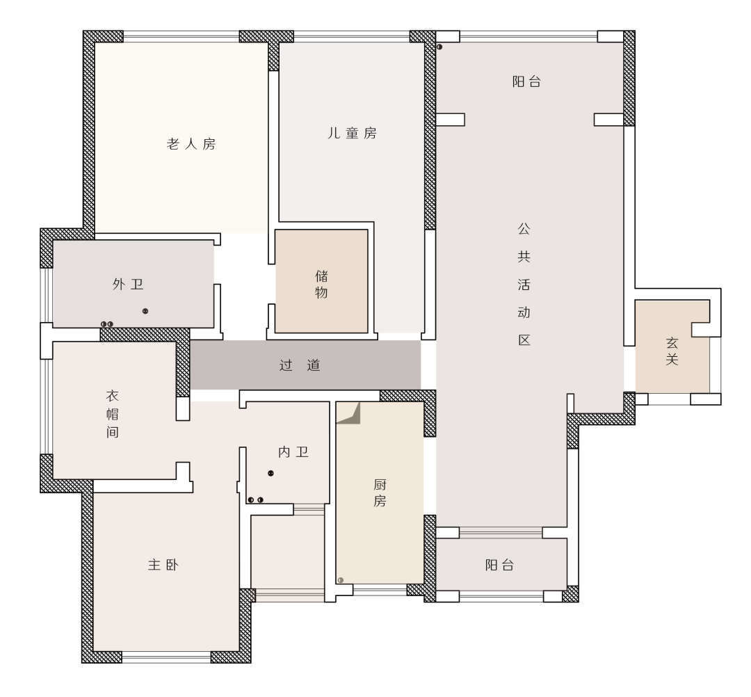 解决方法:过道的北移释放了原始储物间的空间,局部缩小外卫的空间,改变了老人房门的位置,使得老人房可以放下一整面墙的储物柜;