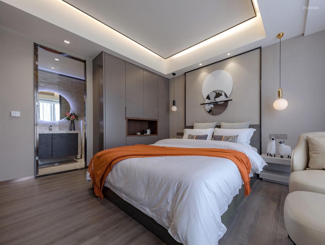背景墙两种纹理呈现不同韵律的分割,360度可旋转电视将书房与卧室串联,白天多屏办公,晚上舒适观影,强化空间和功能的双重体验。