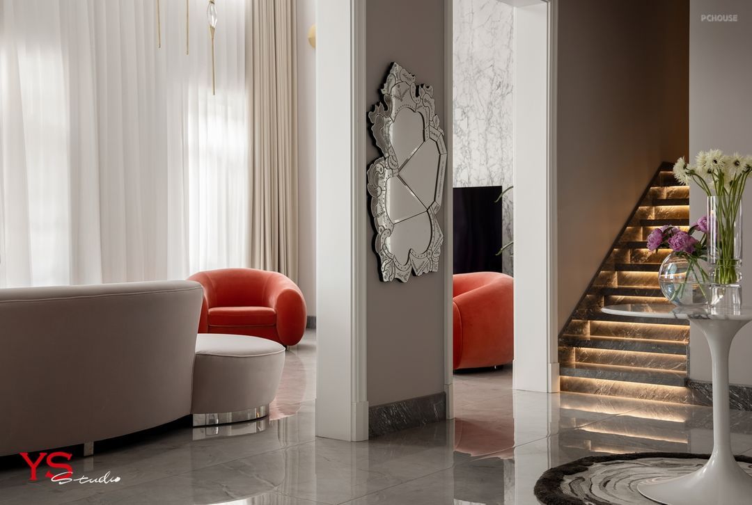 譬如石材的微小投影、楼梯间的灯带、瓷砖与沙发质地的交融,都是设计师的小心思