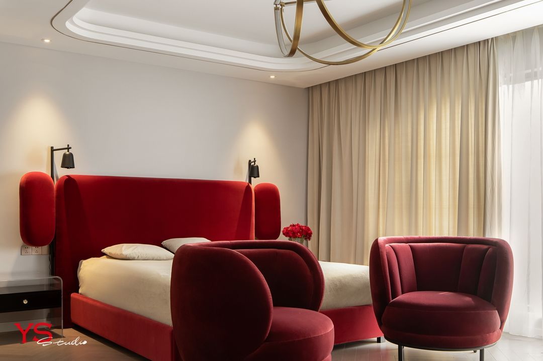 次卧的颜色选择更沉稳,给本命年的妈妈定制了一款很正的红色床体和两个单人沙发。