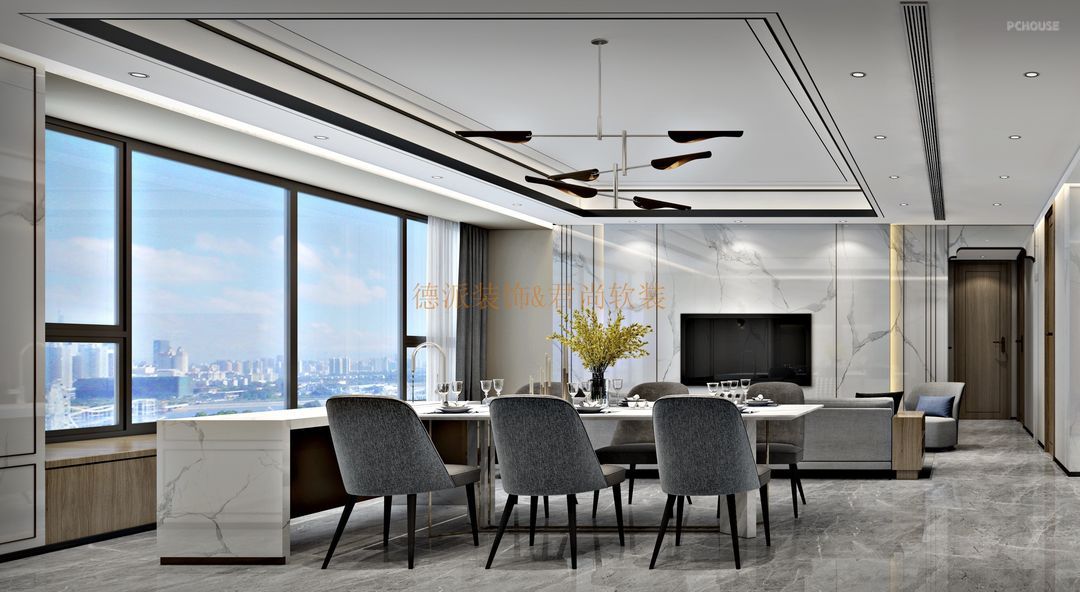 客餐厅的格局是一个纵向的开放式大空间,玻璃的大面积使用,使得客厅空间显得明亮而宽敞,充足的光线奠定了简约而温暖的空间氛围。