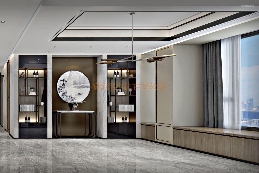 搭配同样中式意境的极简玄关案台,营造出一个古色古香的氛围。