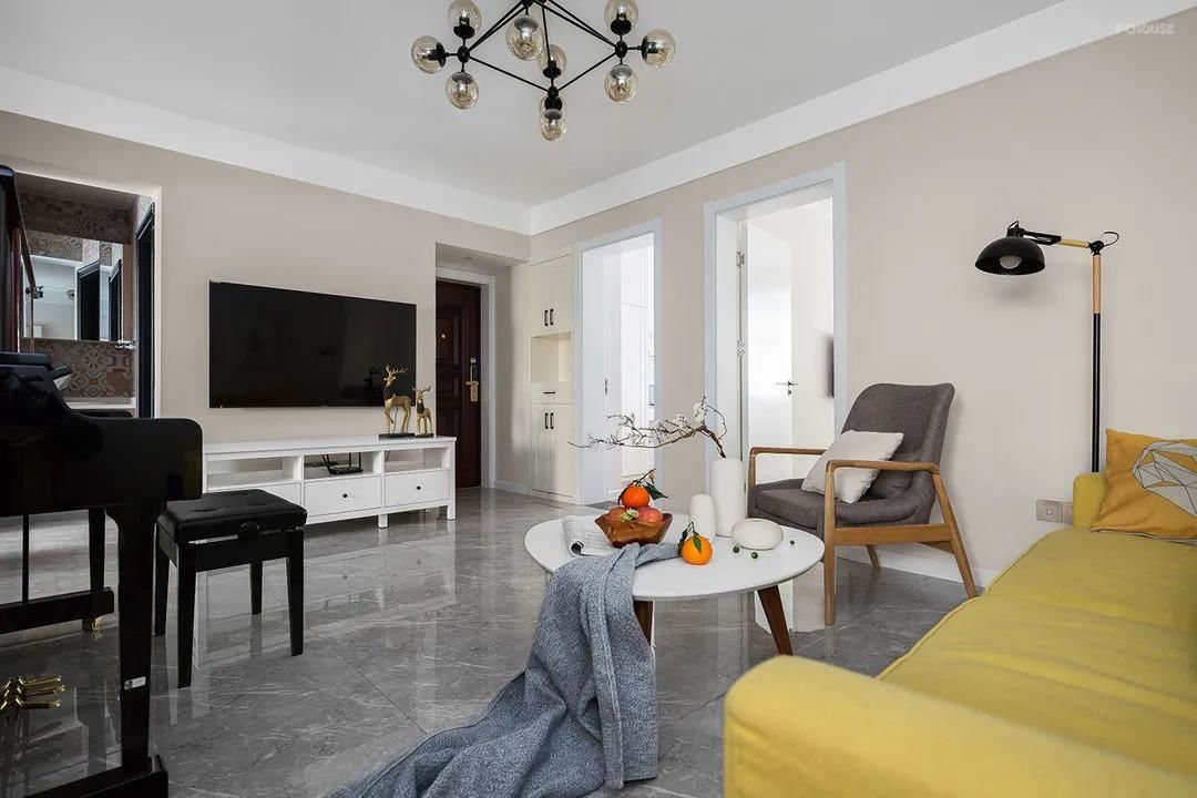 客厅以暖色系为主,墙面统一采用米色乳胶漆涂刷,视觉上更显舒适慵懒。顶面以白色为主,地面以灰色系地砖铺陈,空间层次感更明朗。黄色的沙发点缀,让空间多了几分活泼跳跃的气质。除了基础家具外,还摆放了一架钢琴,让孩子在家中也可以练习。
