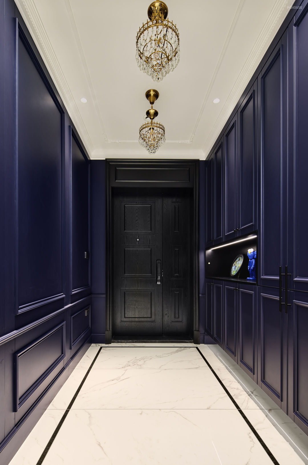 主卧延续了具有年代感的生活仪式,在确保业主生活习惯与功能的需求下,采用复古与色彩的艺术表现,以细腻的纹理和线条诠释优雅精致。