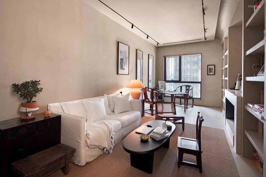 书房是区别于其他空间的另一番静谧天地。米色系微水泥仿佛细沙一般的质感,粗制棉麻沙发,古朴的木质桌椅,墙面装点的大小各异的水墨字画,透出一份难能可贵、质朴的真诚,仿佛可以瞥见这位年轻男主人的身体里居住着的那个古老的灵魂。