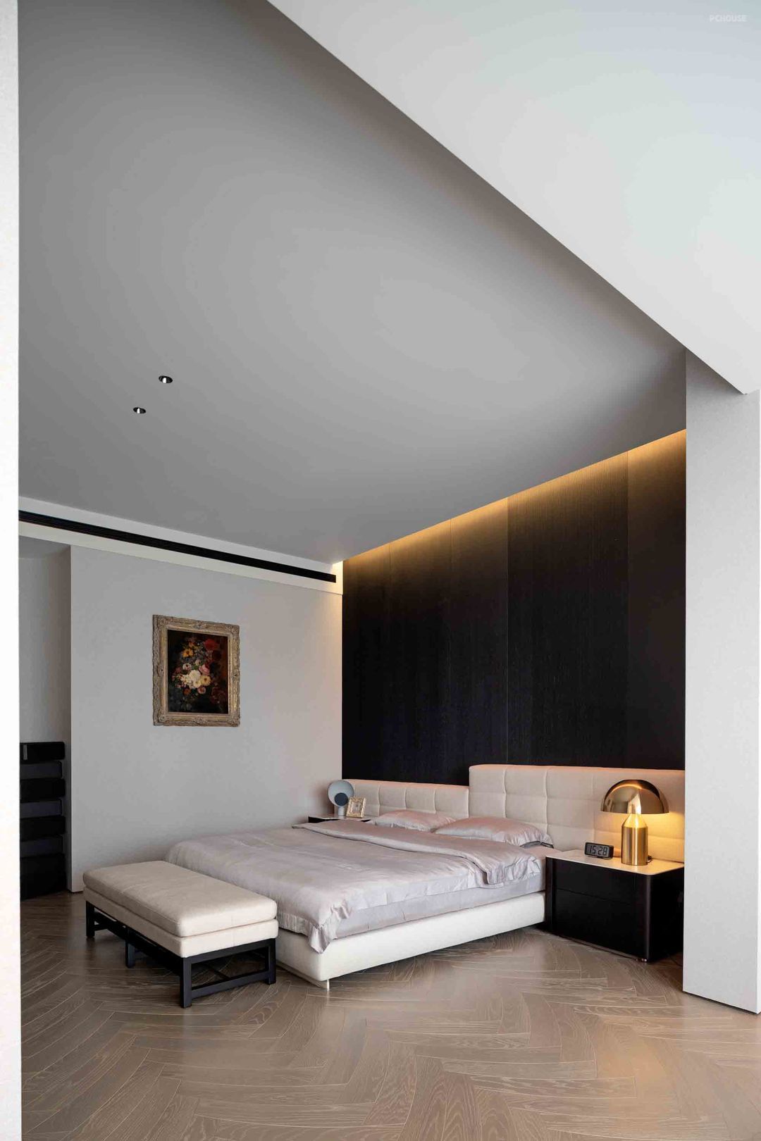 摒弃了一切形式,卧室回归到最本真的模样,墙面点缀着男主人收藏的欧式油画,繁与简,深与浅,宁静,深邃。
