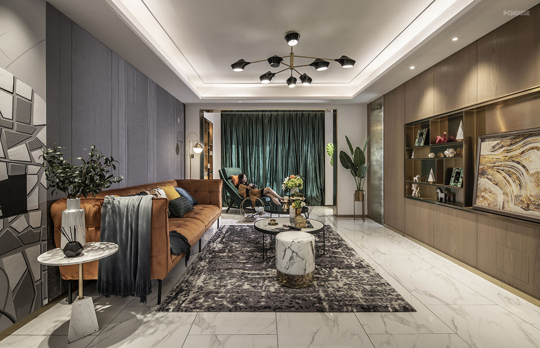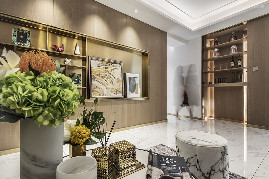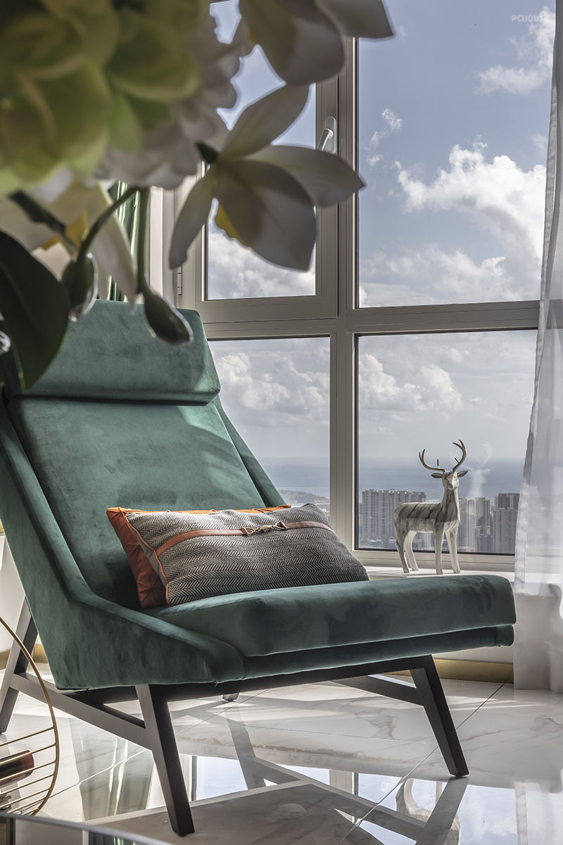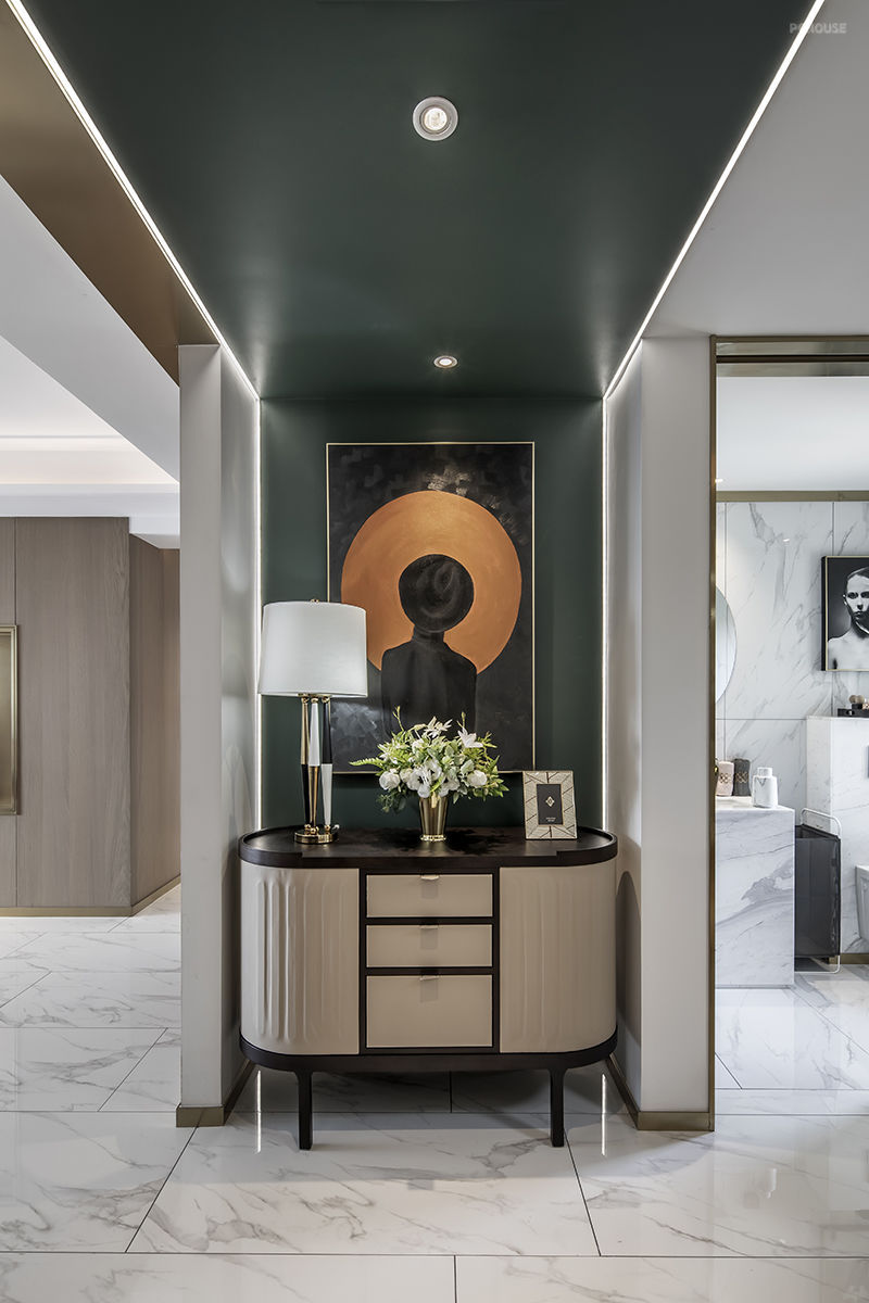 前言: 本案更多的是从一个纯粹的空间角度去做设计,整体空间的墙顶面都选用极简的方式,属于一个极度中性色彩的硬装感受。门厅却选用了很有分量感的软配去修饰,有别于其他房屋的画品与石材修饰,用一份若大的木质框体组成的画呈现在门厅的墙面,有一种别样理智的庄重,色彩上选用一个近似群青的克莱因蓝,与羽毛的吊灯于空中交相呼应,庄重而不高冷,理智尚且柔情。正如这屋女主人的气质一般,她是独当一面的职场女性,也是家中二宝的搞怪妈妈。客厅里有大龙喜欢的葛优躺,也有二胖喜欢的随处爬。这个是他们最享受的一个状态。只有庞大的收纳系统做支撑,才能让居住者真正的享受空间。设计师用它的方式,将最大空间的尺度给到他们,肆意奔跑打闹,这个也是给他们童年最好的礼物。