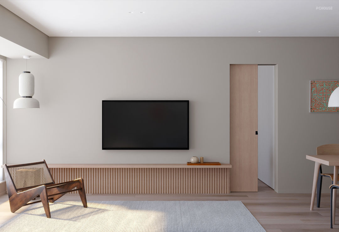 不拘于特定的风格,客厅的莫兰迪色调柔和自然,卧室木质移门置于背景之中过渡自然,整个空间干净素雅。