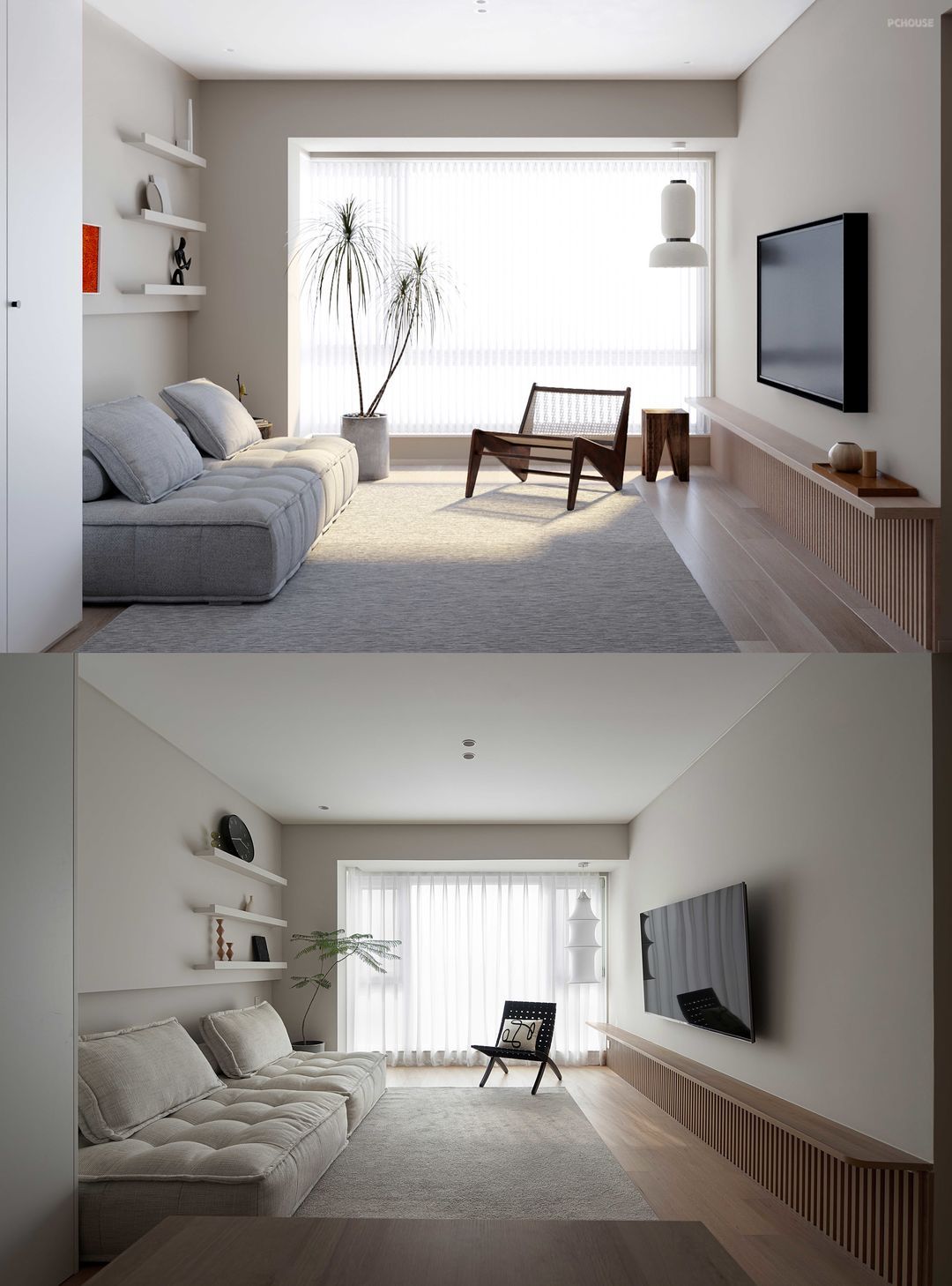 ▲客厅效果图&实景图对比(效果图上,实景图下)
