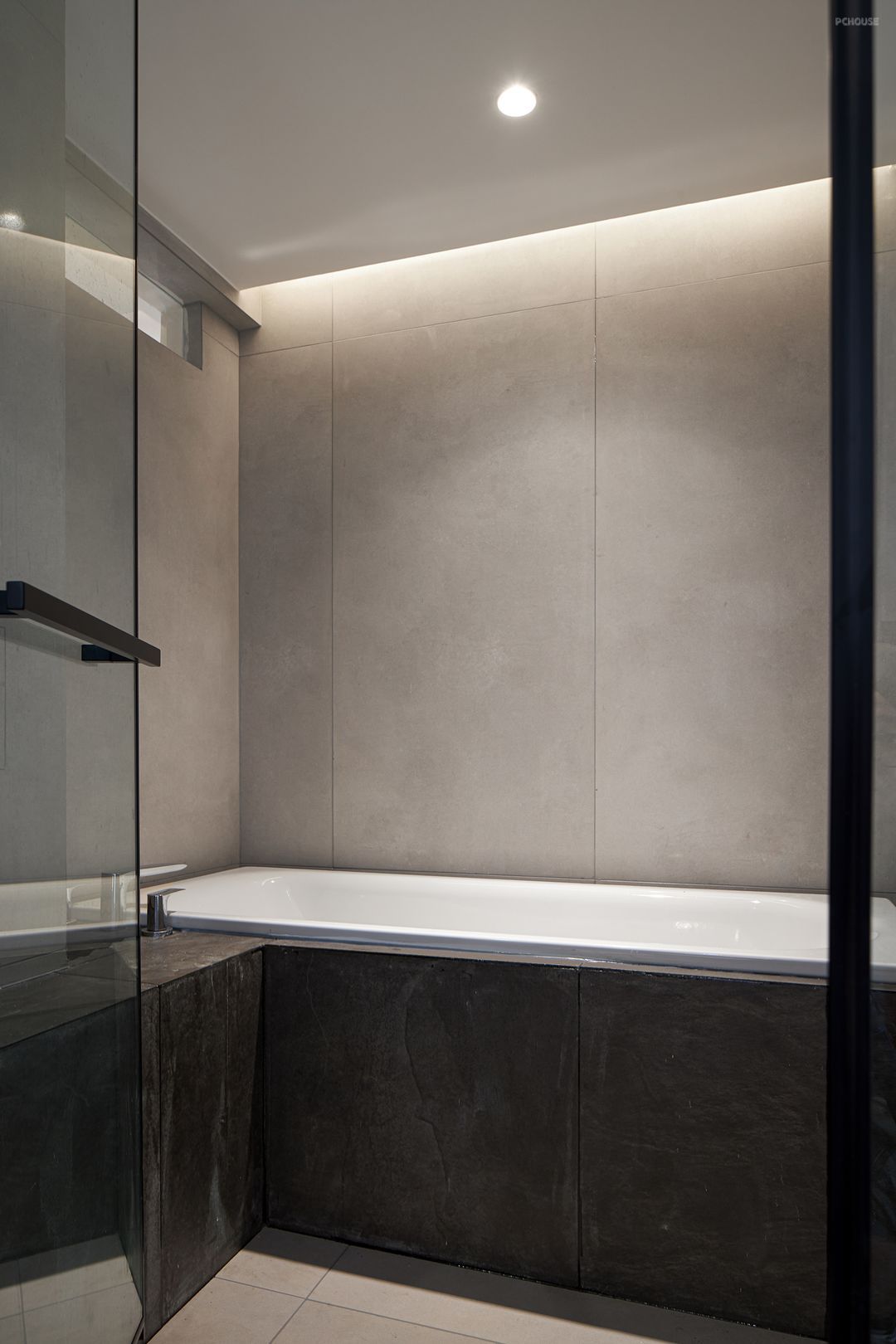 不仅仅追求需求功能的完善,更要满足精神需求的慰藉。关闭主照明的筒灯,保留线条灯,光晕下一团雾气腾起,舒适放松的氛围让一天的疲惫也随之消散。
