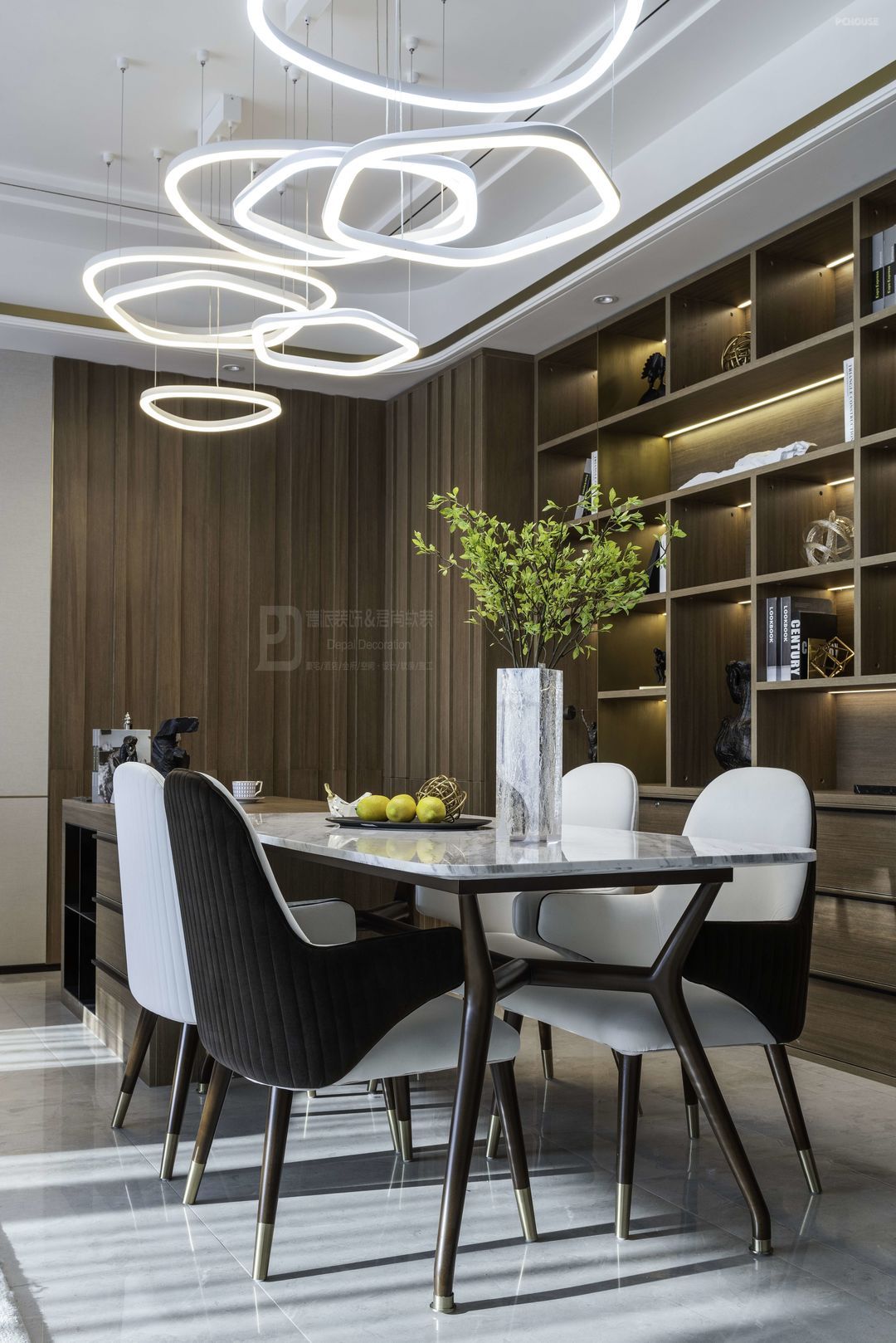 墙面的大理石增添了空间的轻奢气息。上方的环形吊灯富有设计美感。