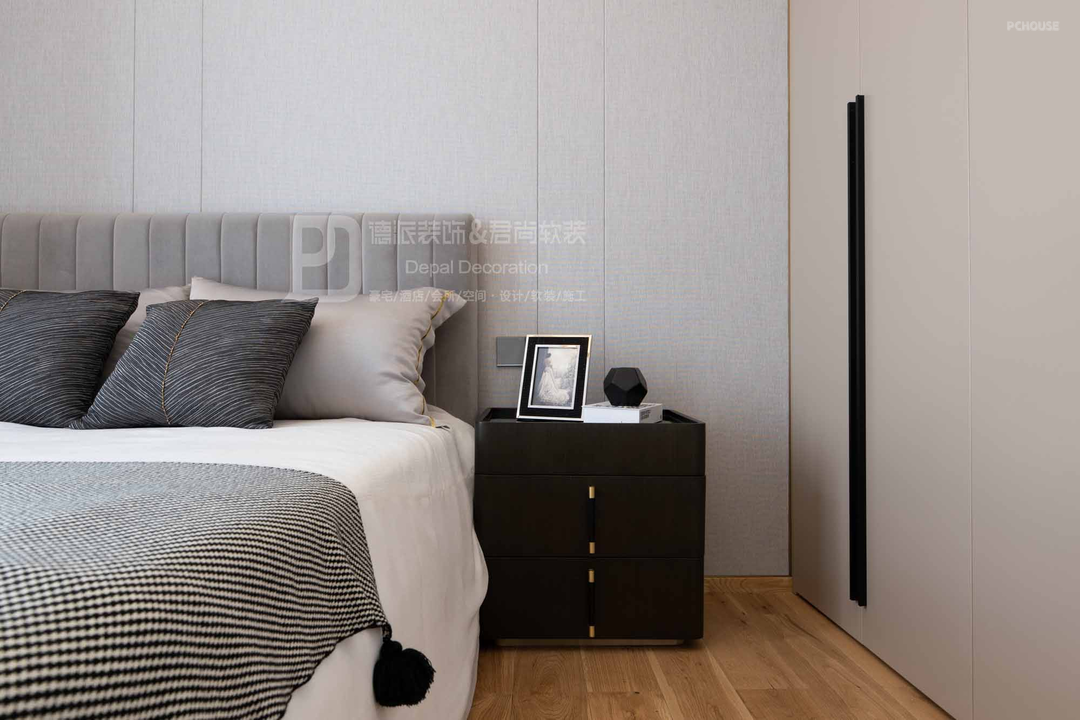 卧室中,设计师选用浅灰色与木色作为空间的主色调,没有多余的矫饰,简约而不失质感。