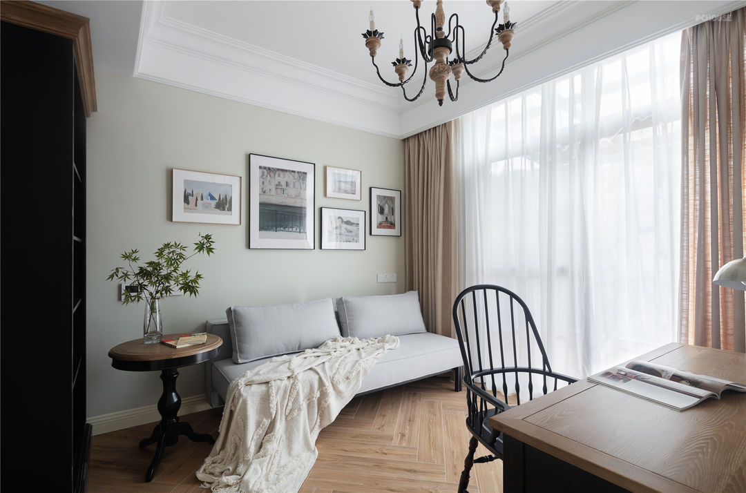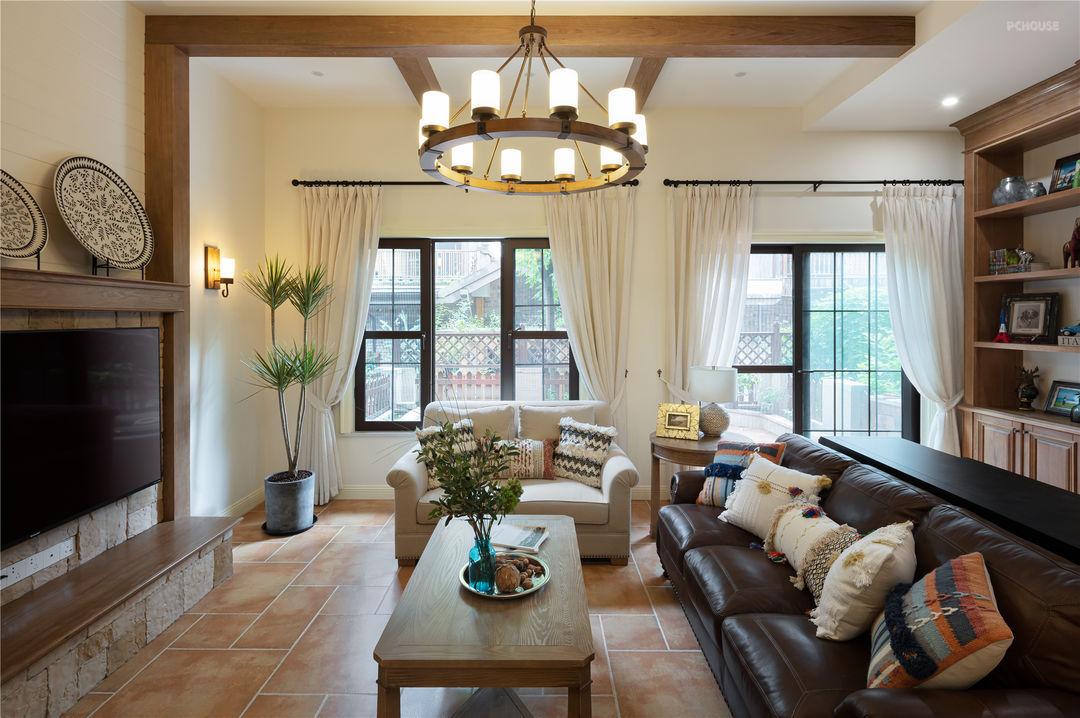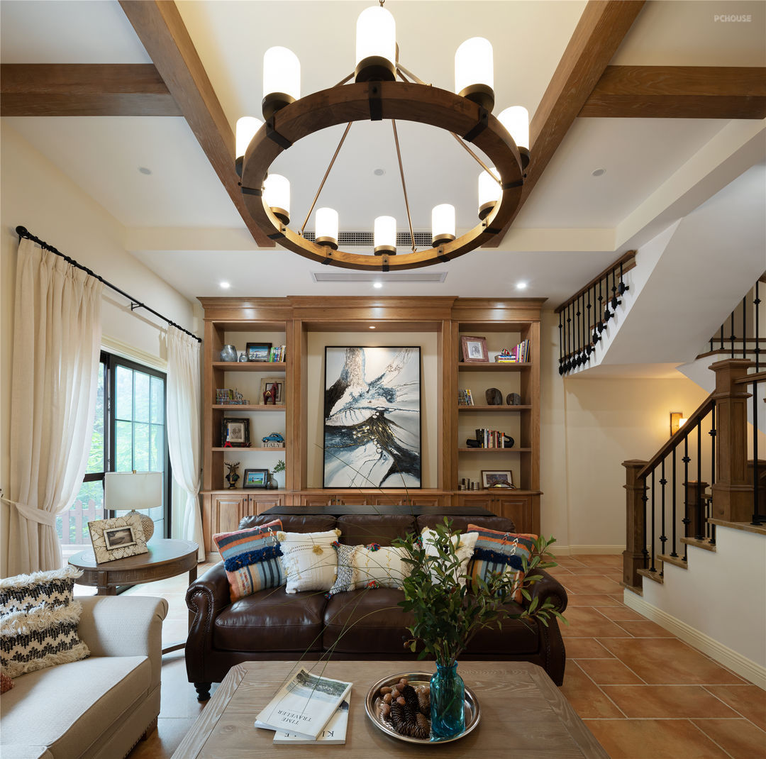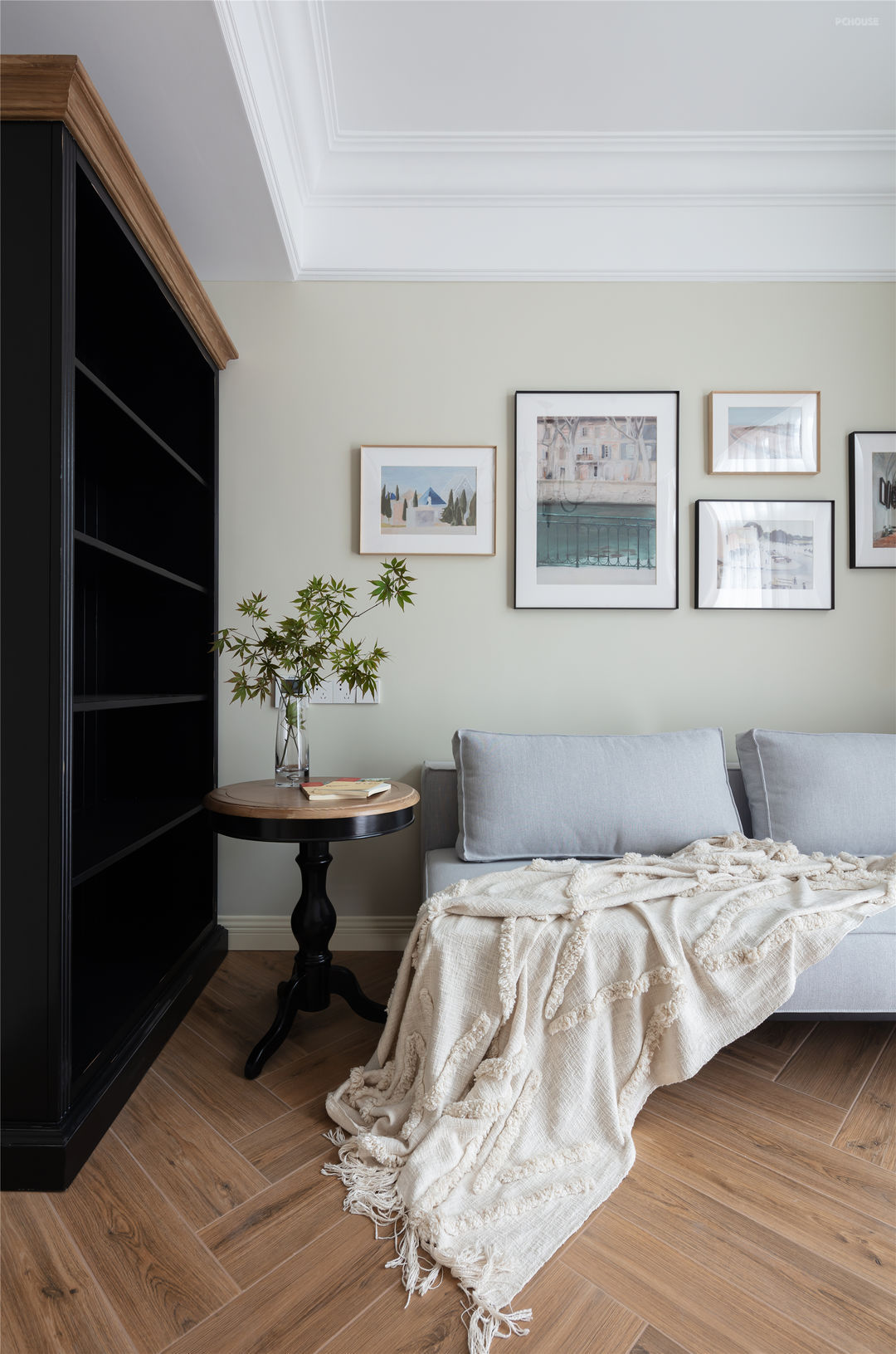 客厅多采用木质家具,黑、白、蓝三色交相呼应体现着美式复古的大气自然。沙发后侧的壁柜上摆满了相框及独特的小物件,生活气息十足。中间的一幅水彩画填补了空间的空缺,使整体更加内敛低调。