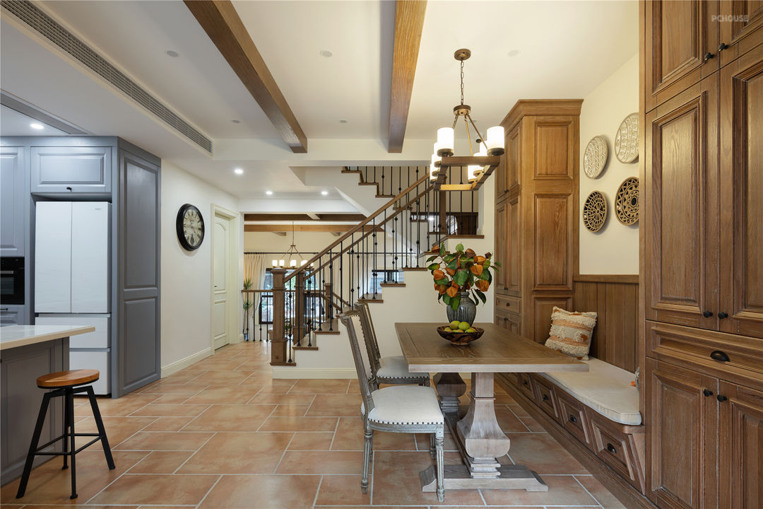 从玄关进门就是开放式厨房,既节省了空间,使得空间更显简洁通透,又体现出美观实用的整体感。客厅的空间较大,布置了多个沙发和椅凳,为客人的到来做好了充足准备。