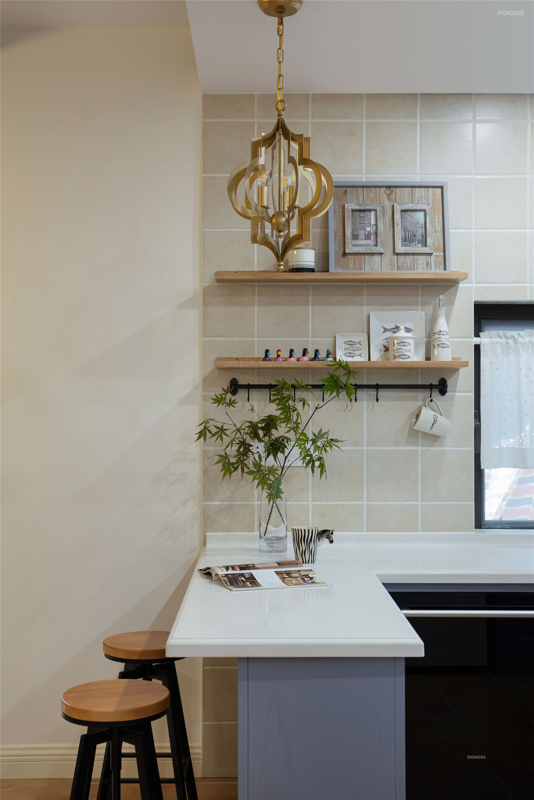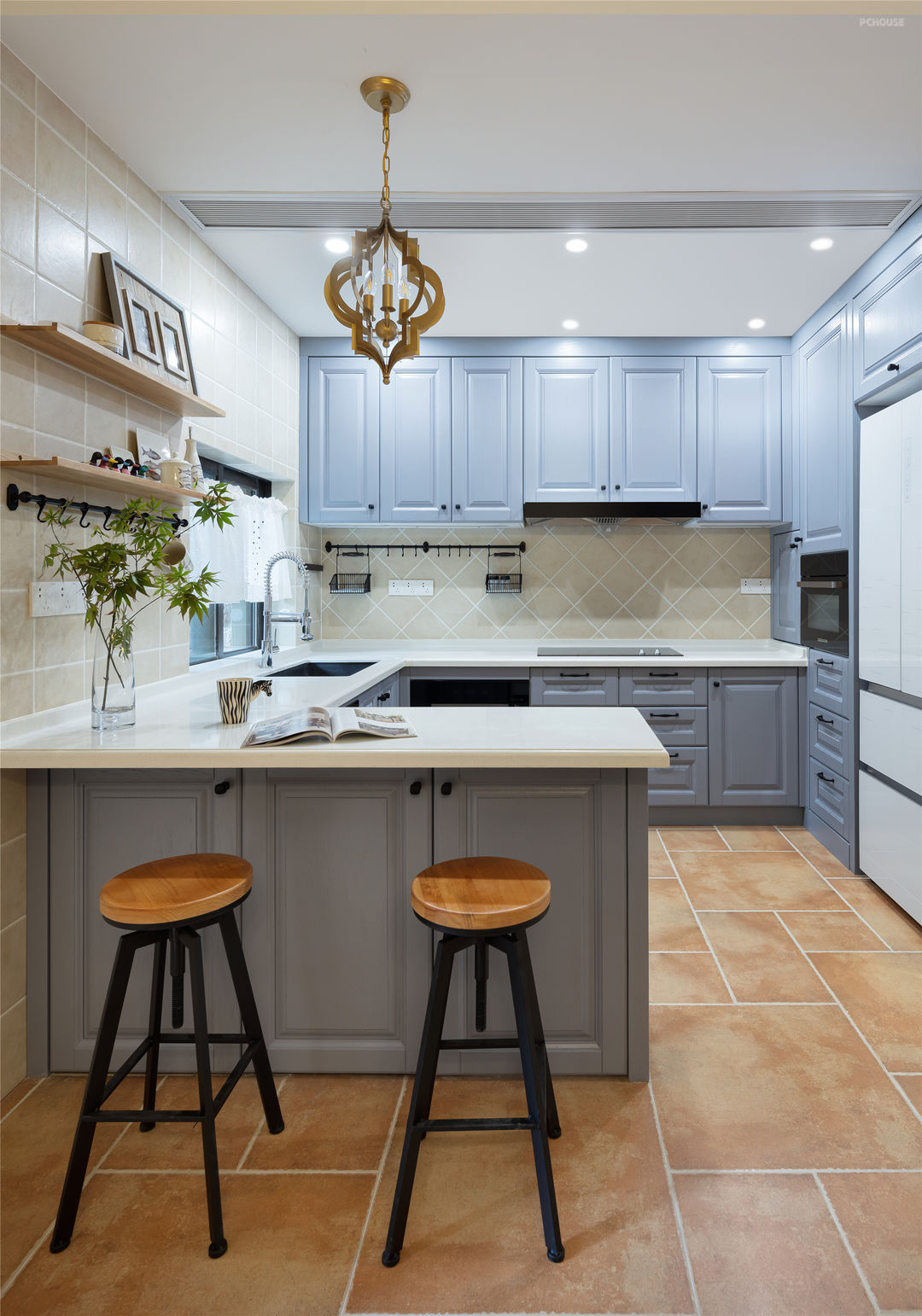 白色的主色调更显明亮活泼,有助于创造空间的错觉。位于上方浅蓝的橱柜清爽而又充满时尚感,并且增加了做饭时候拿物的方便性。开放式的厨房让一家人都能体验下厨的乐趣。