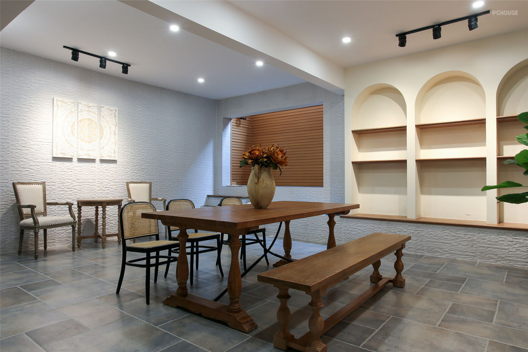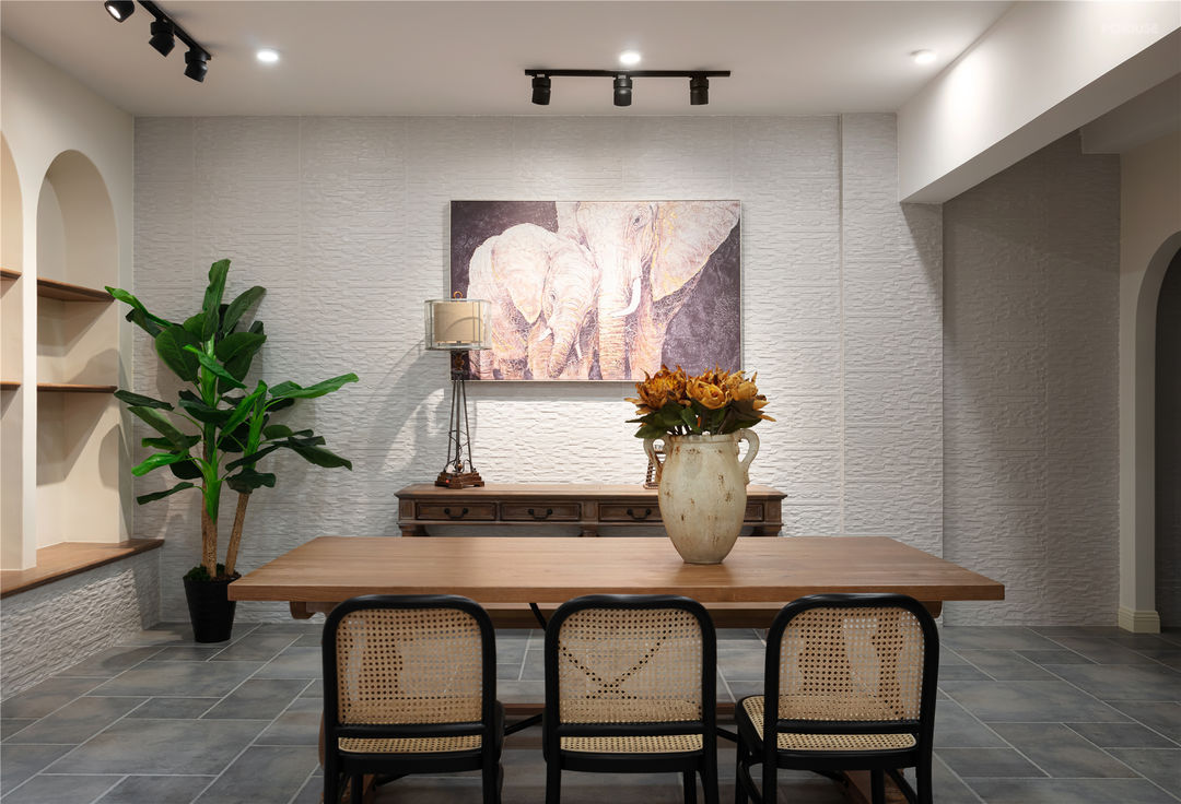 多个小灯附在长方型的木框,悬挂在素白的墙上,整体雅致而温暖。桌上的绿植映衬着木质为主的设计,让人用餐时仿佛置身于大自然,美好温馨。