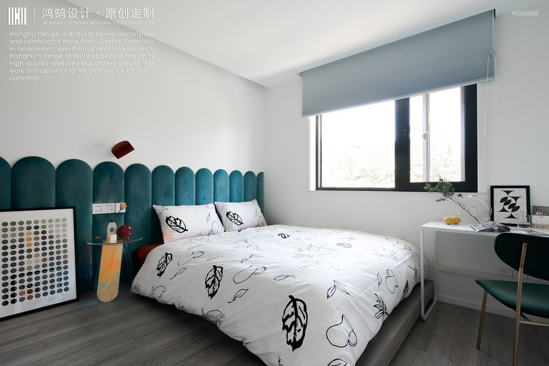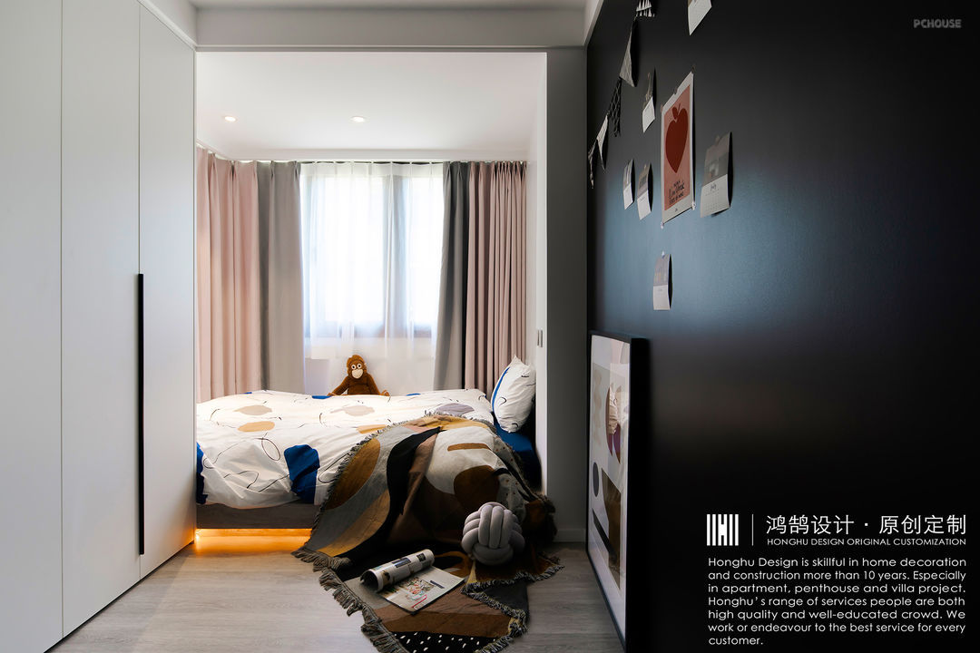 次卧房间,考虑到小朋友年纪还比较小,前期有许多玩具,所以想最大化的利用好阳台部分,做了带弧形的异形地台床,除了放床垫的空间,还有一个可以堆放玩具的小区域,避开放普通床会导致死角太多这一问题.