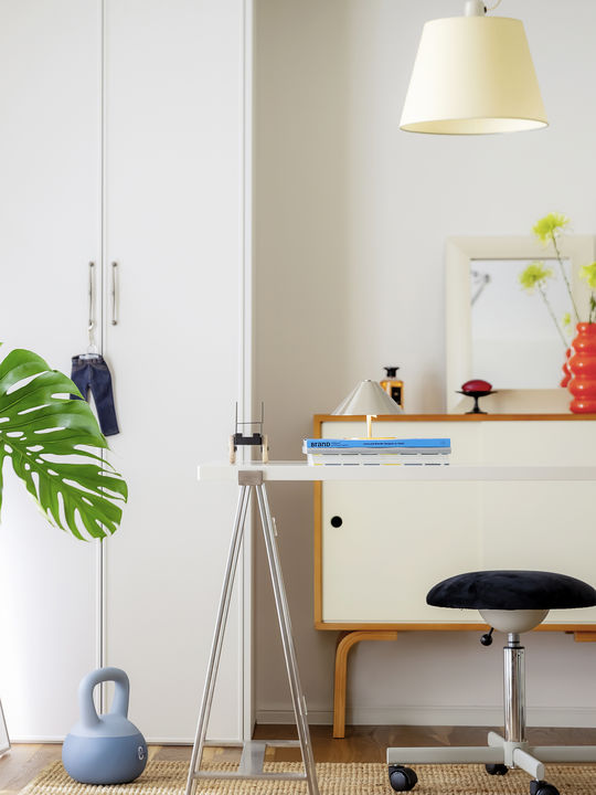 餐厅的色调比较低调沉稳,大理石餐台与混搭风餐椅,暗橘色为空间增添了色彩。靠墙设立柜,胡桃色柜体与部门白色柜门的碰撞。区分了展示区与玻璃门区,可以放置不同类别的物品。(实景图)