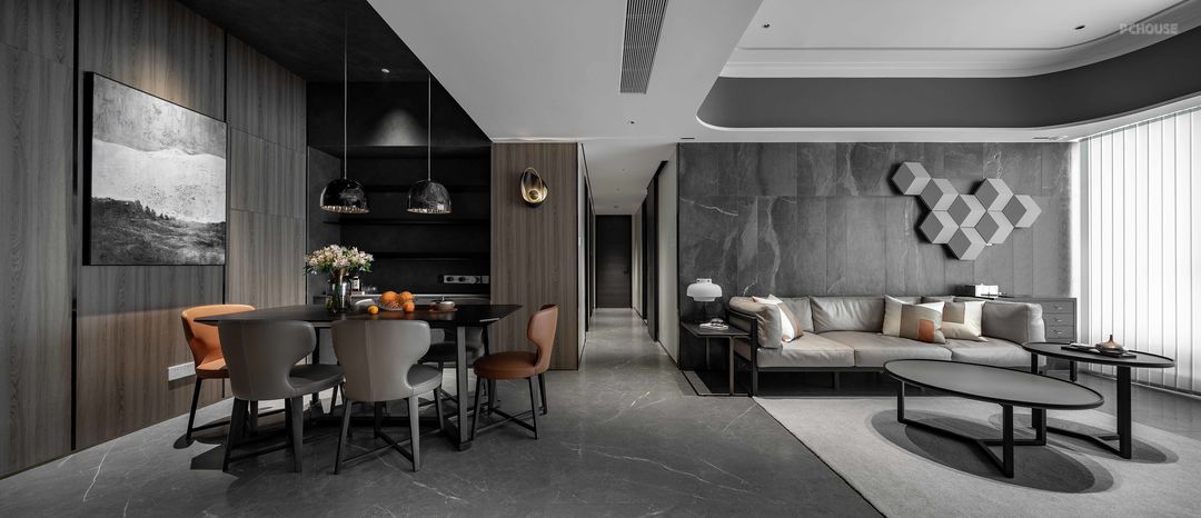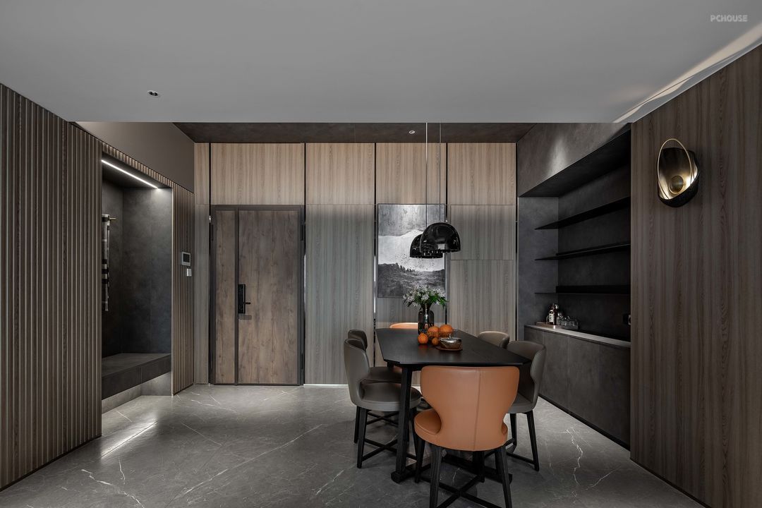 前言: 屋主陈先生是一位儒雅的70后,饱读诗书且看过大千世界,整体装饰元素都是沉稳克制的,灰调的材质虽暗却明,点缀零星橘色软装提亮空间。随着孩子长大,父母适当放手,一家人可以更多的关注自己,空间布局是分离又联合的。