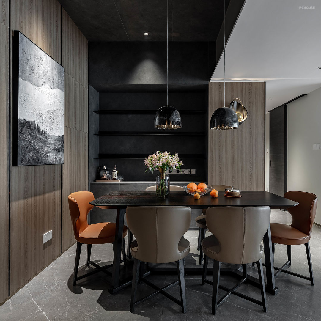 餐边柜作为公共区域的水吧台,设置水具酒具等实现就近取物的动线,钢制层板同时具有展示陈列功能,下方柜门也可满足收纳。夜里只开层板灯和餐桌吊灯,三五好友相聚品酒谈天,氛围恰到好处。