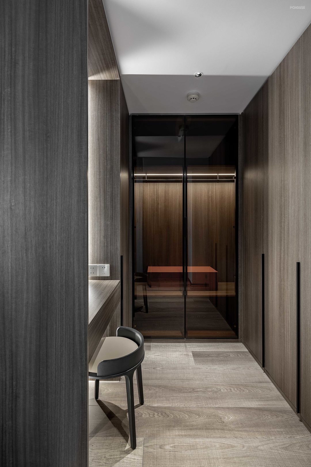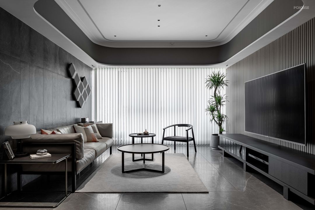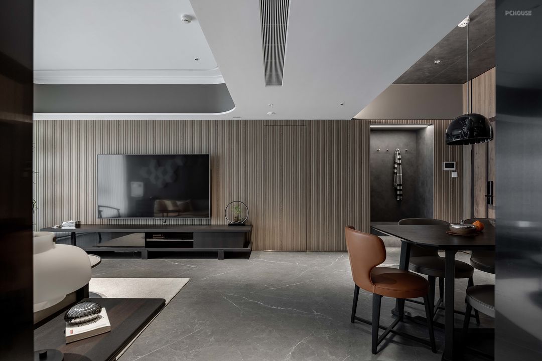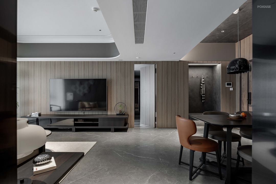公共空间做了一整面的格栅墙来延长视觉感,将主卧门和鞋柜都做了隐形处理,关上门能更好的保证空间完整性与私密性。