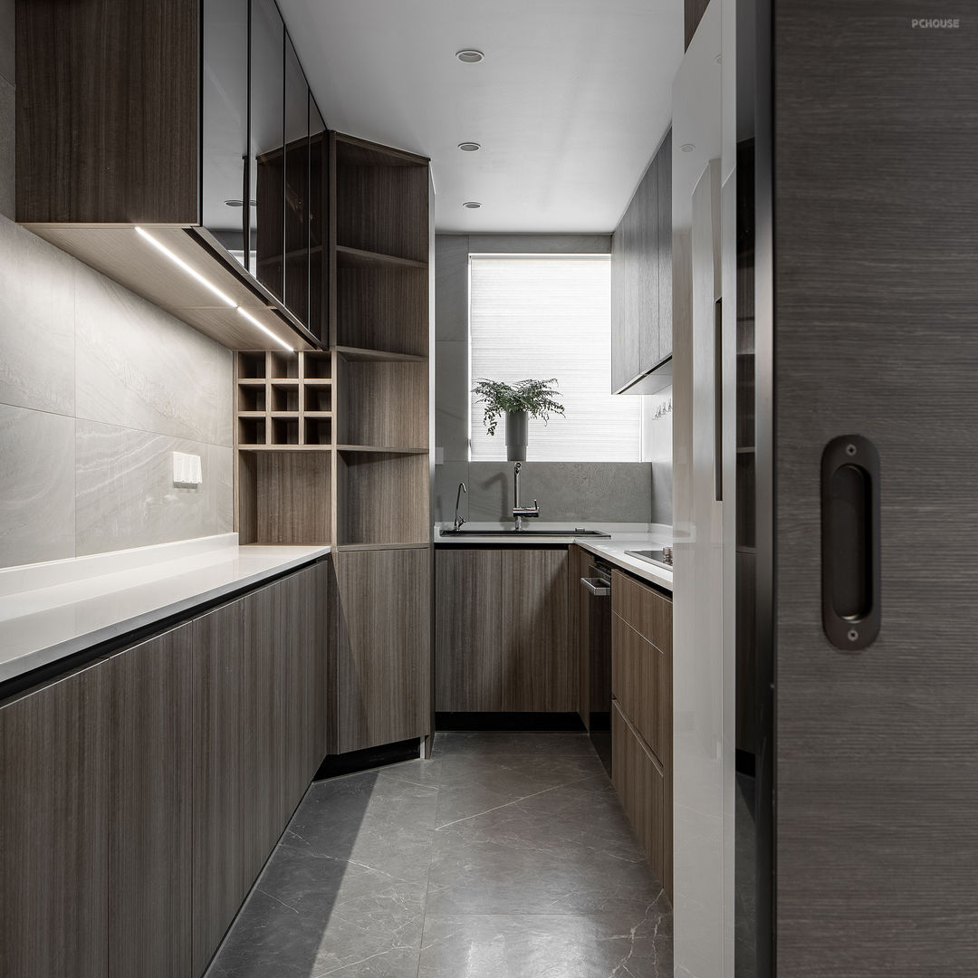 原本的厨房很小,放置水槽和灶具后台面和柜内空间都很紧张。厨房墙向隔壁卧室借了一些空间,得到现在的U型厨房,烟道用斜角柜削弱压迫感,左侧35cm深的台面可以摆放一列小厨电,节省出富余的操作空间,也增加了相应储物量。