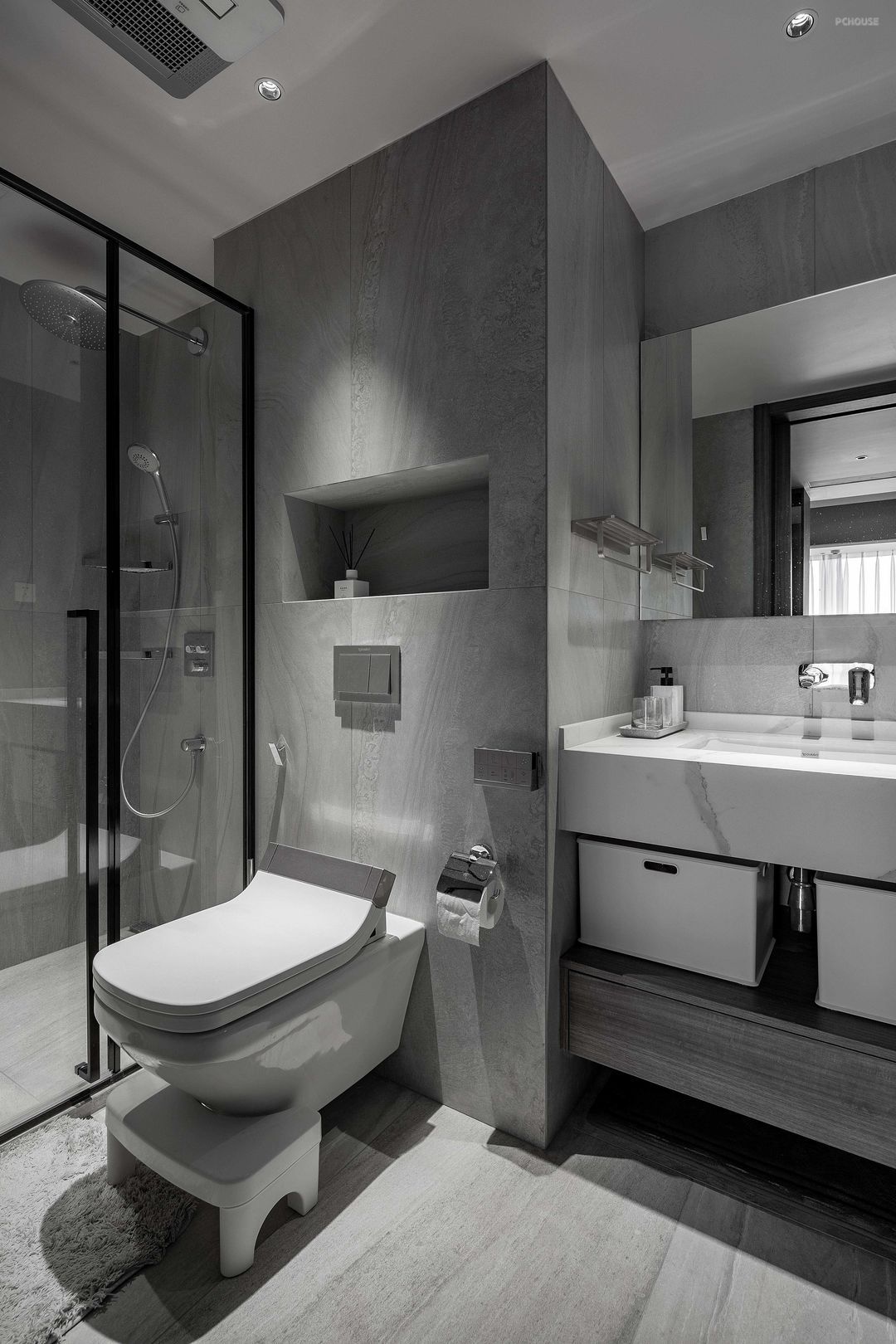 公卫做了三分离,长辈过夜或是有亲友来访,不容易堵车。为了保证马桶排污通畅,没有移位,所以将淋浴靠